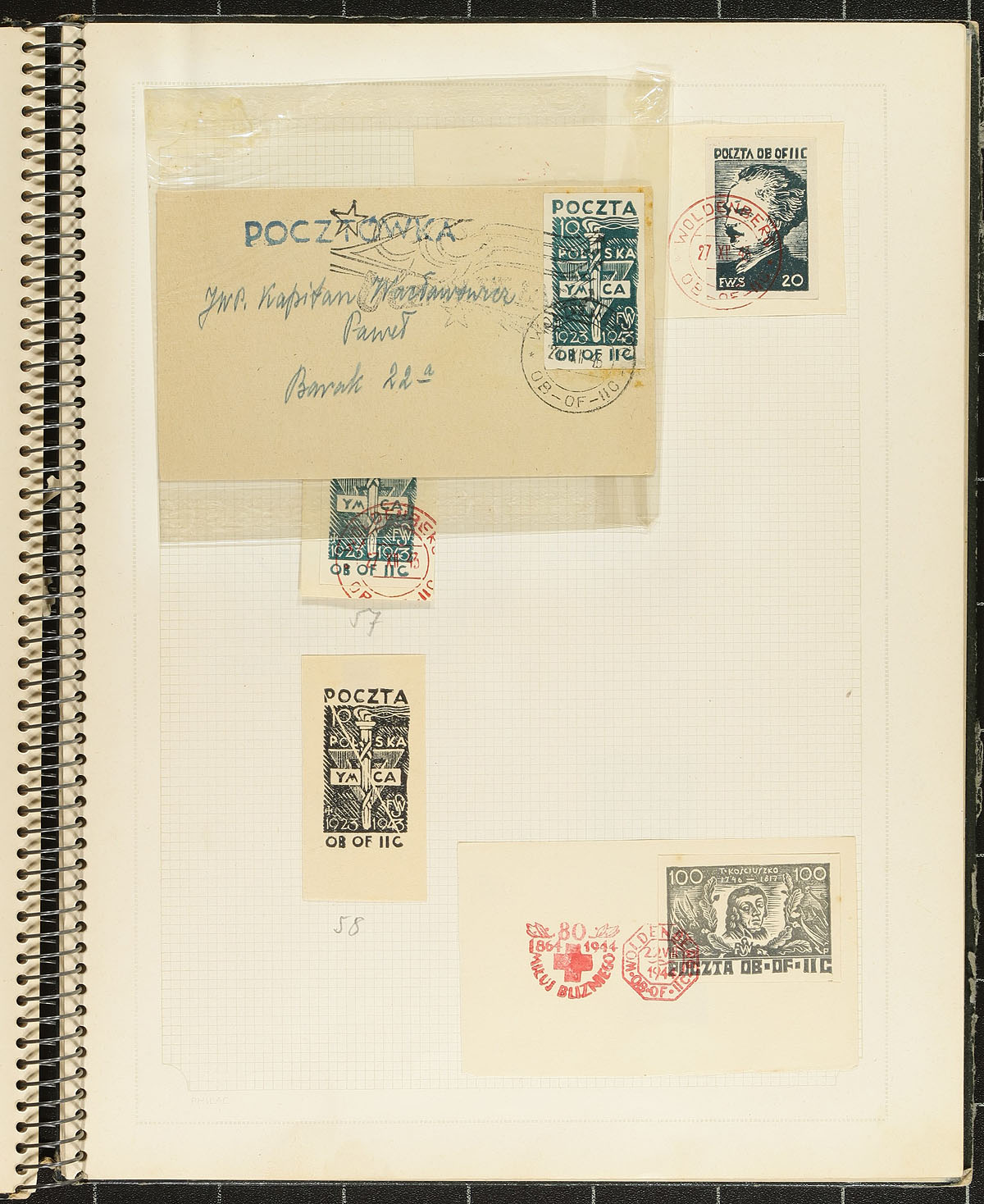 Visually powerful group of Polish POW Camp Woldenberf 1942-1944 camp issued provisional local stamps. The camp was located 1km from Woldenberg housed (at its peak) 5944 officers and 796 orderlies in 25 brick huts, over the 62 acre camp. These philatelically inspired issues have had their use speculated on over the years, as to whether they had actual use (beyond philatelic creation). This lot includes over 100 items including stamps, proof material, postmarks and covers. Listed in Michel catalogue. All neatly hinged in an old-time stamp book (which had travelled for many years with the original Jewish collector who acquired these). The largest assembly of this material we have offered! Estimate =