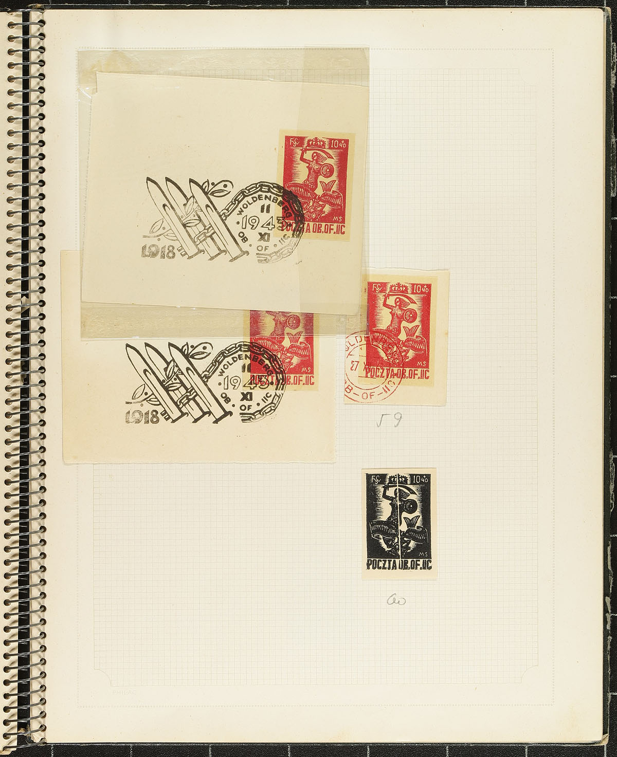 Visually powerful group of Polish POW Camp Woldenberf 1942-1944 camp issued provisional local stamps. The camp was located 1km from Woldenberg housed (at its peak) 5944 officers and 796 orderlies in 25 brick huts, over the 62 acre camp. These philatelically inspired issues have had their use speculated on over the years, as to whether they had actual use (beyond philatelic creation). This lot includes over 100 items including stamps, proof material, postmarks and covers. Listed in Michel catalogue. All neatly hinged in an old-time stamp book (which had travelled for many years with the original Jewish collector who acquired these). The largest assembly of this material we have offered! Estimate =