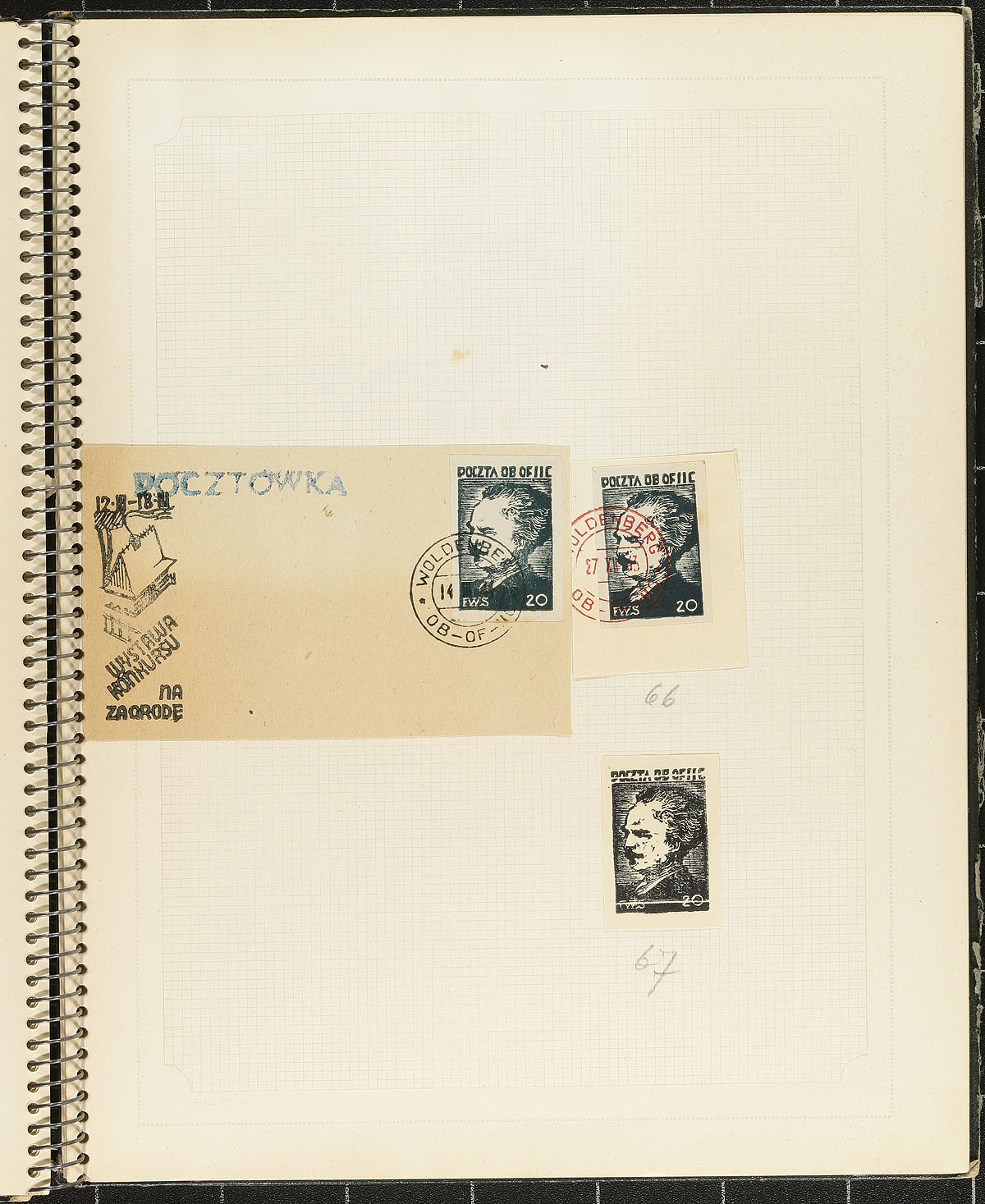 Visually powerful group of Polish POW Camp Woldenberf 1942-1944 camp issued provisional local stamps. The camp was located 1km from Woldenberg housed (at its peak) 5944 officers and 796 orderlies in 25 brick huts, over the 62 acre camp. These philatelically inspired issues have had their use speculated on over the years, as to whether they had actual use (beyond philatelic creation). This lot includes over 100 items including stamps, proof material, postmarks and covers. Listed in Michel catalogue. All neatly hinged in an old-time stamp book (which had travelled for many years with the original Jewish collector who acquired these). The largest assembly of this material we have offered! Estimate =
