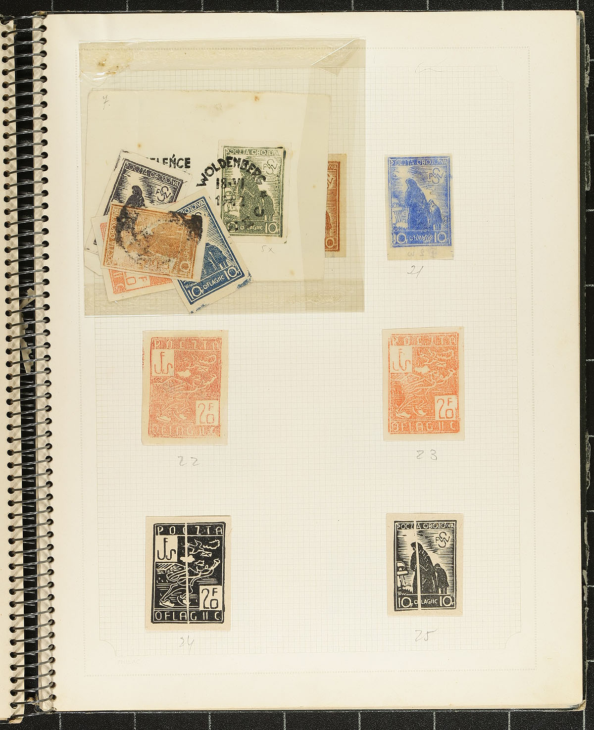 Visually powerful group of Polish POW Camp Woldenberf 1942-1944 camp issued provisional local stamps. The camp was located 1km from Woldenberg housed (at its peak) 5944 officers and 796 orderlies in 25 brick huts, over the 62 acre camp. These philatelically inspired issues have had their use speculated on over the years, as to whether they had actual use (beyond philatelic creation). This lot includes over 100 items including stamps, proof material, postmarks and covers. Listed in Michel catalogue. All neatly hinged in an old-time stamp book (which had travelled for many years with the original Jewish collector who acquired these). The largest assembly of this material we have offered! Estimate =
