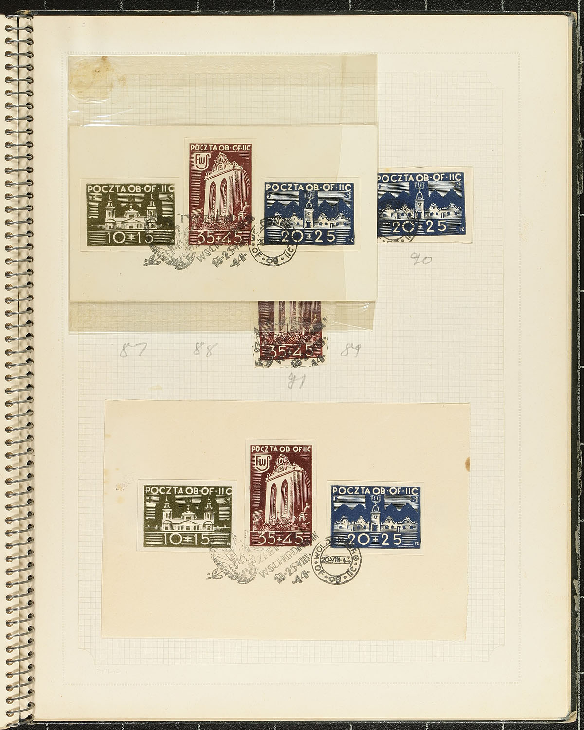 Visually powerful group of Polish POW Camp Woldenberf 1942-1944 camp issued provisional local stamps. The camp was located 1km from Woldenberg housed (at its peak) 5944 officers and 796 orderlies in 25 brick huts, over the 62 acre camp. These philatelically inspired issues have had their use speculated on over the years, as to whether they had actual use (beyond philatelic creation). This lot includes over 100 items including stamps, proof material, postmarks and covers. Listed in Michel catalogue. All neatly hinged in an old-time stamp book (which had travelled for many years with the original Jewish collector who acquired these). The largest assembly of this material we have offered! Estimate =