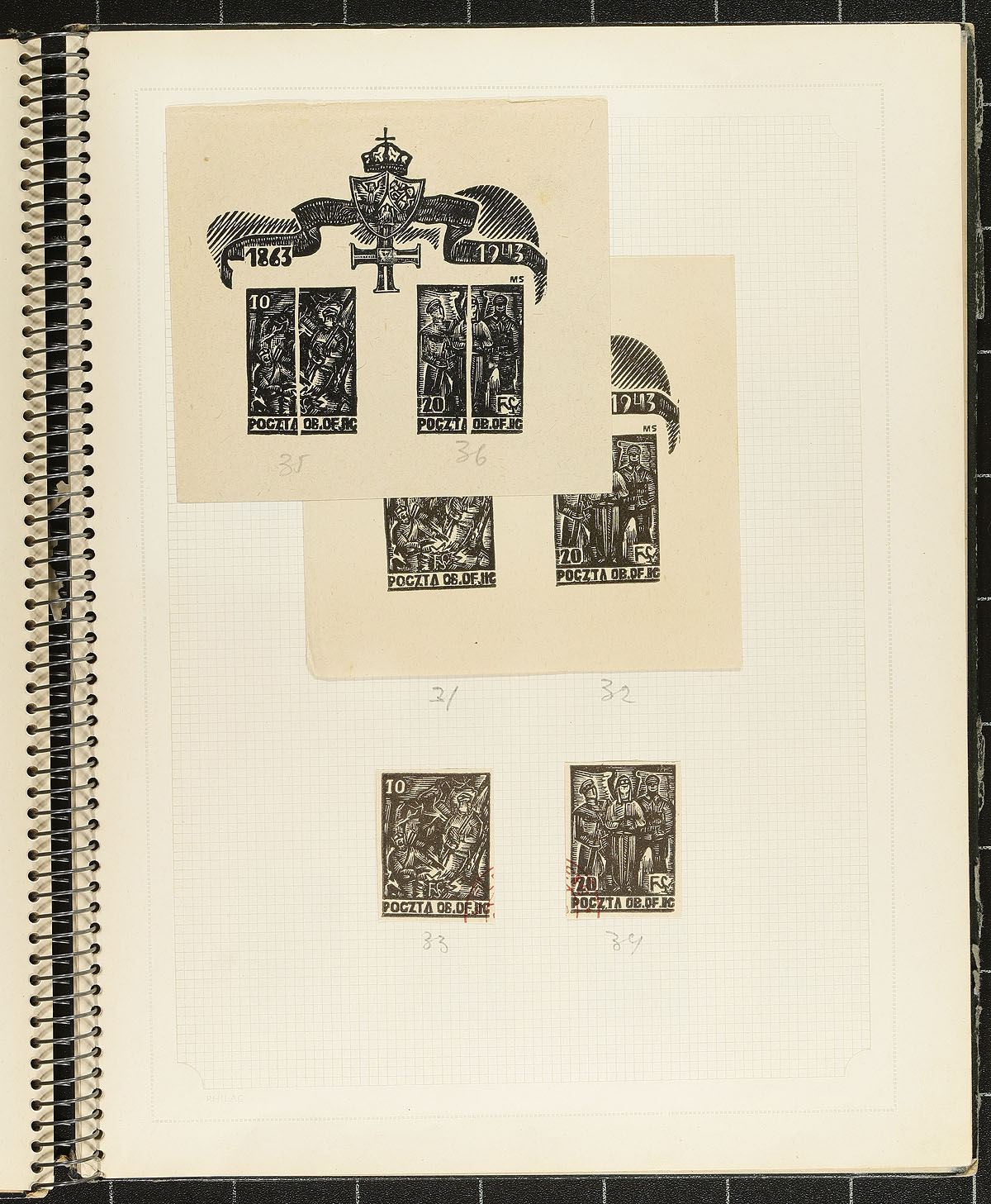 Visually powerful group of Polish POW Camp Woldenberf 1942-1944 camp issued provisional local stamps. The camp was located 1km from Woldenberg housed (at its peak) 5944 officers and 796 orderlies in 25 brick huts, over the 62 acre camp. These philatelically inspired issues have had their use speculated on over the years, as to whether they had actual use (beyond philatelic creation). This lot includes over 100 items including stamps, proof material, postmarks and covers. Listed in Michel catalogue. All neatly hinged in an old-time stamp book (which had travelled for many years with the original Jewish collector who acquired these). The largest assembly of this material we have offered! Estimate =