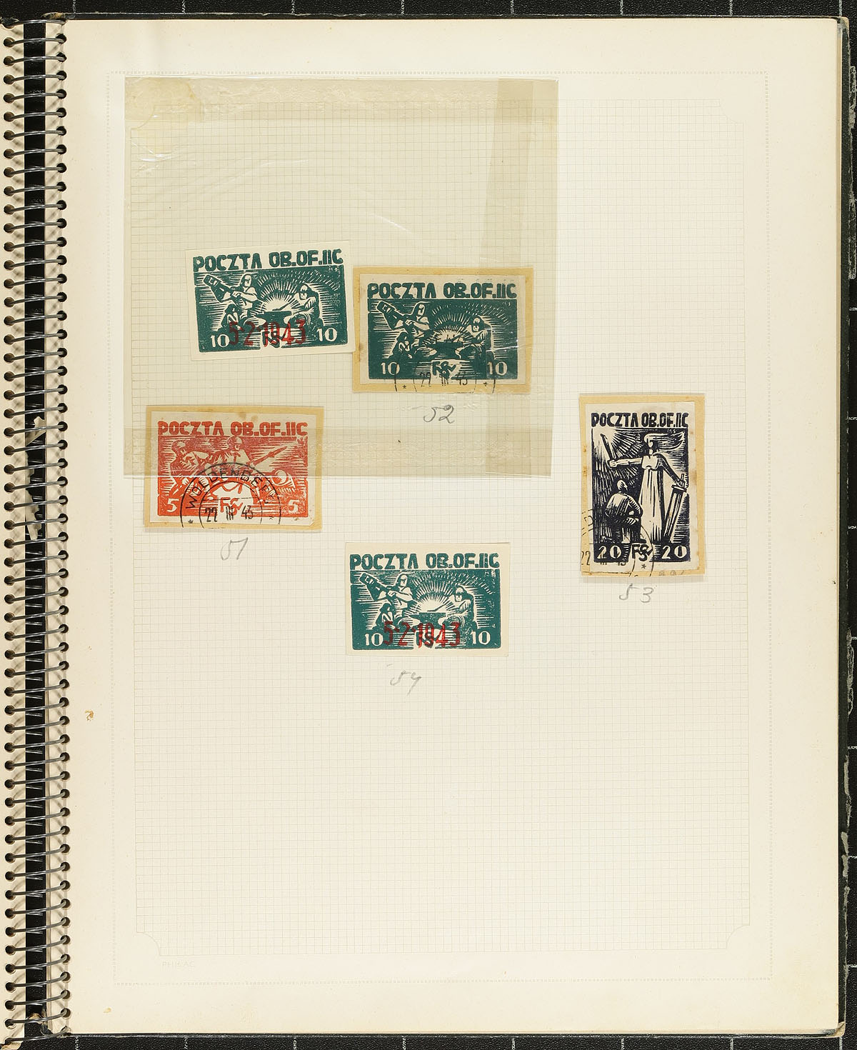 Visually powerful group of Polish POW Camp Woldenberf 1942-1944 camp issued provisional local stamps. The camp was located 1km from Woldenberg housed (at its peak) 5944 officers and 796 orderlies in 25 brick huts, over the 62 acre camp. These philatelically inspired issues have had their use speculated on over the years, as to whether they had actual use (beyond philatelic creation). This lot includes over 100 items including stamps, proof material, postmarks and covers. Listed in Michel catalogue. All neatly hinged in an old-time stamp book (which had travelled for many years with the original Jewish collector who acquired these). The largest assembly of this material we have offered! Estimate =