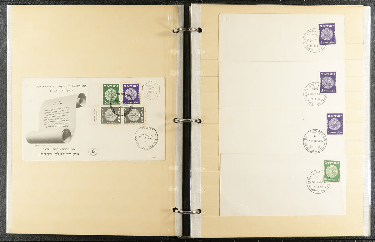 Collection of Special Postmark Covers. Album containing 60 covers from the 1948-1954 period including Interim Mail (the first two covers likely worth the estimate alone). Included an old-time 1953 Simon's Catalogue of Israel Stamps. Estimate =