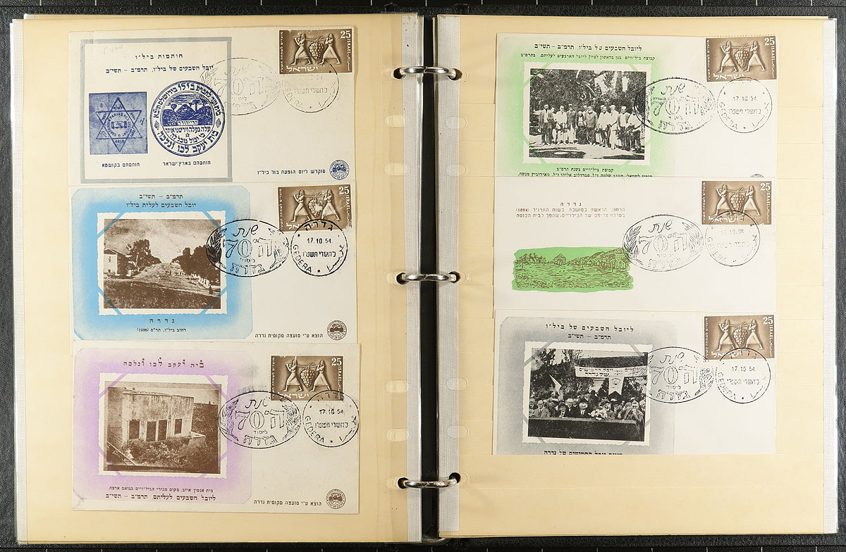 Collection of Special Postmark Covers. Album containing 60 covers from the 1948-1954 period including Interim Mail (the first two covers likely worth the estimate alone). Included an old-time 1953 Simon's Catalogue of Israel Stamps. Estimate =