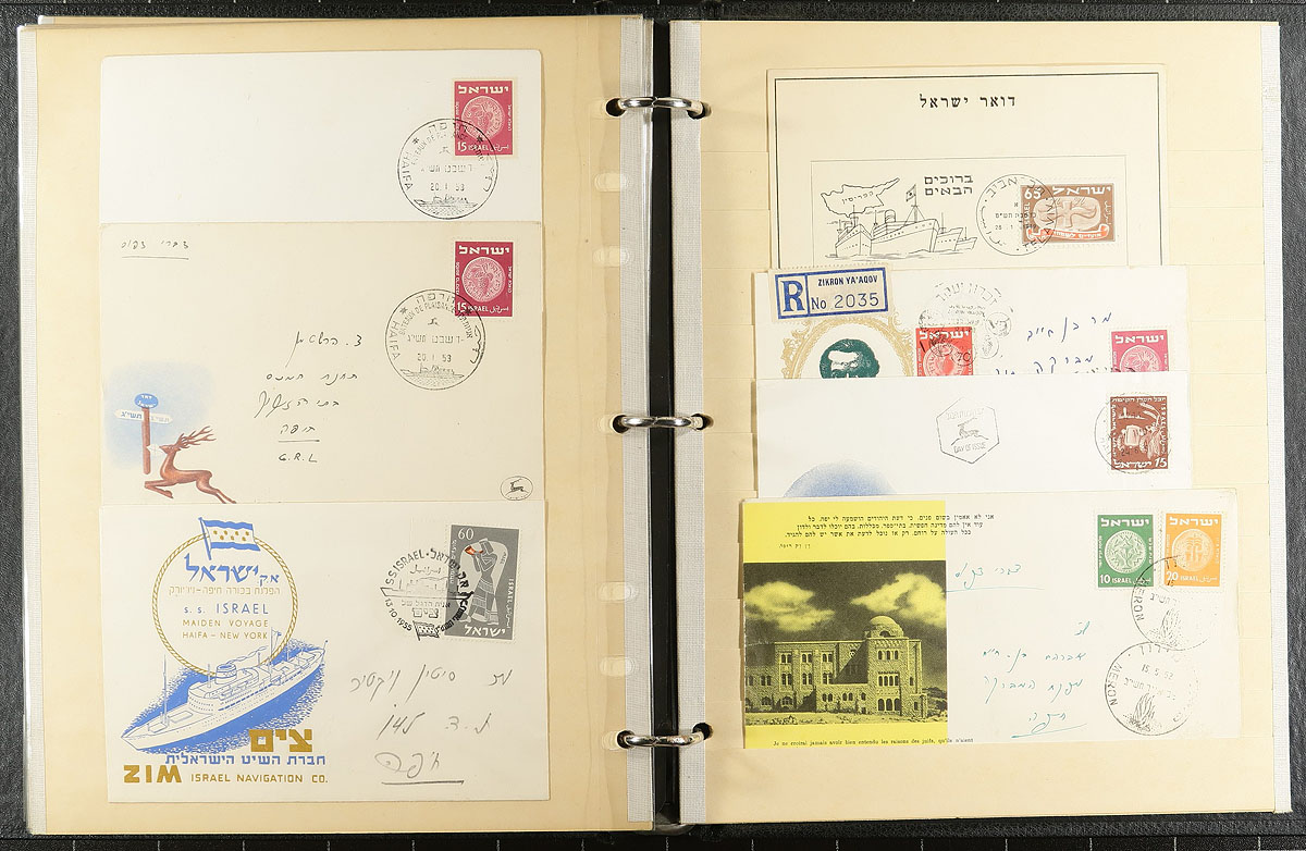 Collection of Special Postmark Covers. Album containing 60 covers from the 1948-1954 period including Interim Mail (the first two covers likely worth the estimate alone). Included an old-time 1953 Simon's Catalogue of Israel Stamps. Estimate =