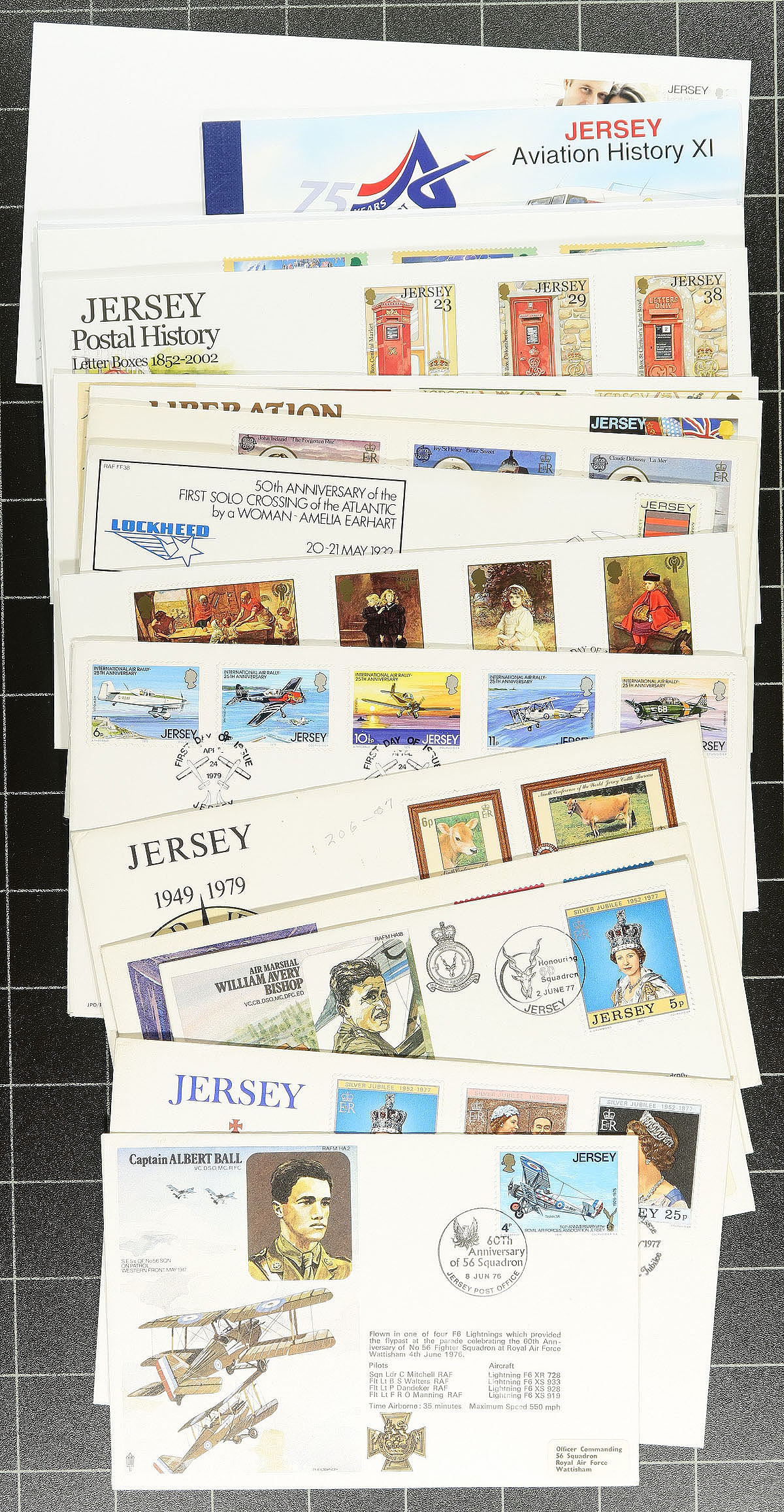 Postal History group. A collector's assembly of 124 covers and postcards, neatly packed within a small box. The lot consists of Guernsey (55), Isle of Man (31) and Jersey (38). Lots of attractive stamps throughout, being mostly sets on cachet first day covers (but with odd commercial item mixed in). We even noted a WWII Jersey occupation cover, of philatelic origin (but most are). Estimate =