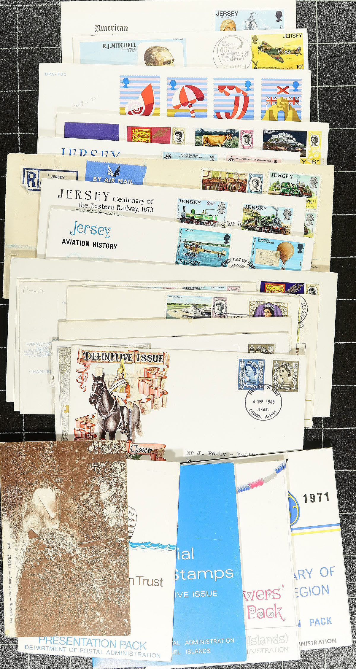 Postal History group. A collector's assembly of 124 covers and postcards, neatly packed within a small box. The lot consists of Guernsey (55), Isle of Man (31) and Jersey (38). Lots of attractive stamps throughout, being mostly sets on cachet first day covers (but with odd commercial item mixed in). We even noted a WWII Jersey occupation cover, of philatelic origin (but most are). Estimate =