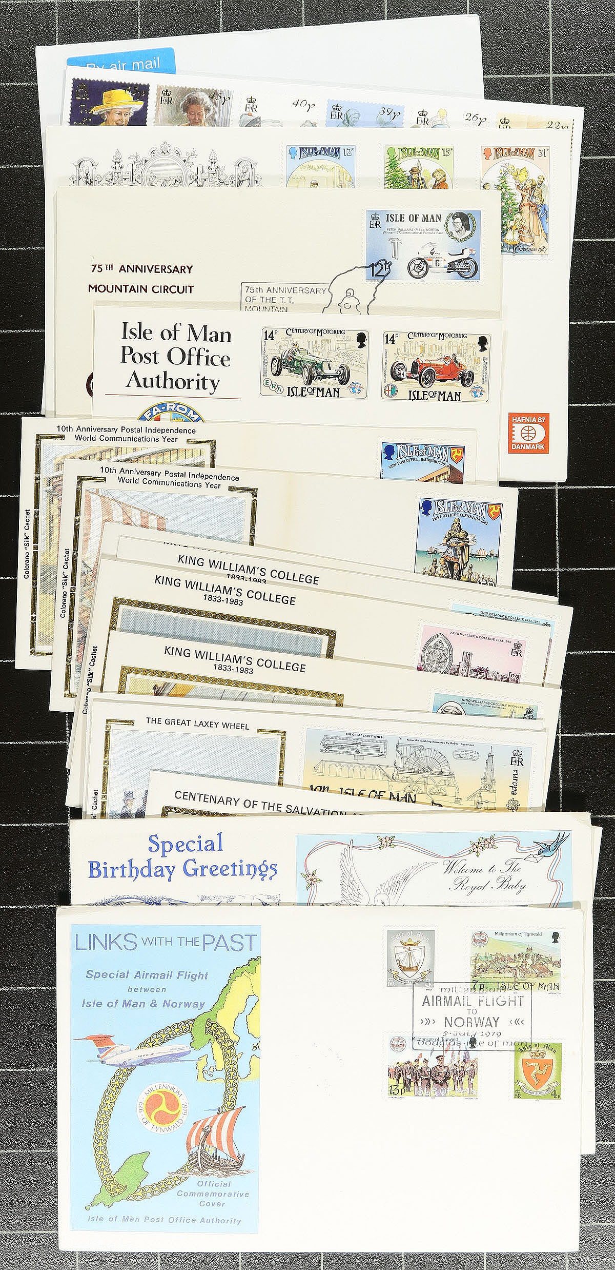 Postal History group. A collector's assembly of 124 covers and postcards, neatly packed within a small box. The lot consists of Guernsey (55), Isle of Man (31) and Jersey (38). Lots of attractive stamps throughout, being mostly sets on cachet first day covers (but with odd commercial item mixed in). We even noted a WWII Jersey occupation cover, of philatelic origin (but most are). Estimate =