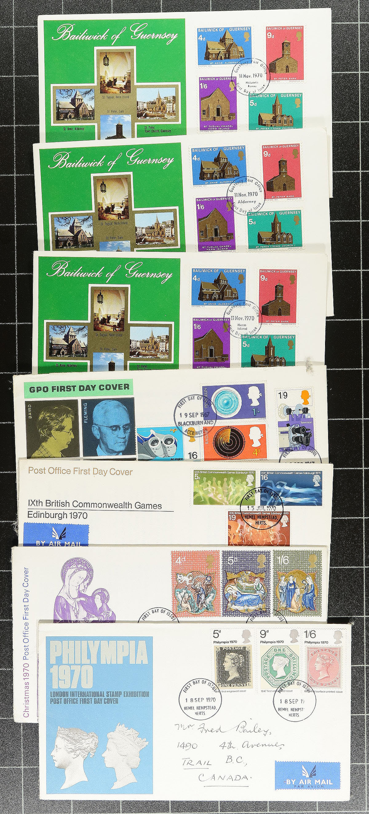 A fascinating clutch of 150 First Day Covers, show / event covers and commercial covers, with some postal stationery from Great Britain, Guernsey and Jersey. Starts with a (damaged) "Penny Black" on a large cover fragment from January 1841 and four pre-#33 "Penny Red" covers. There is a group of commercial and first day covers of the Guernsey occupation issues, the British first day covers are generally cacheted, with some potentially better issued between the 1953 Coronation and the early 1970’s. Noted a £5 Machin and some nice commemorative cancels. Perhaps the most intriguing item is a £5 Traveler’s Check from 1922 for the Bank of Montreal, London with both Canadian and British revenue stamps. Didn’t see anything after 1980. Estimate =