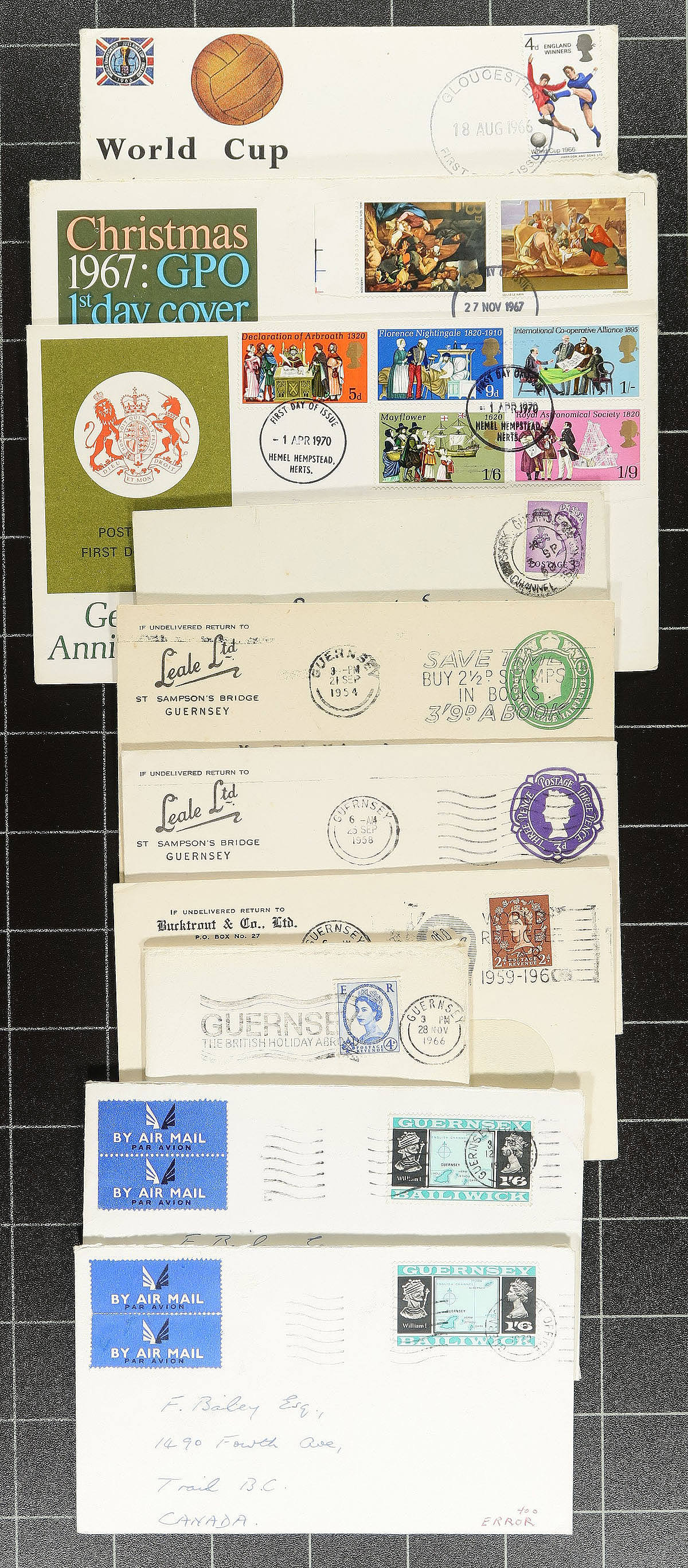 A fascinating clutch of 150 First Day Covers, show / event covers and commercial covers, with some postal stationery from Great Britain, Guernsey and Jersey. Starts with a (damaged) "Penny Black" on a large cover fragment from January 1841 and four pre-#33 "Penny Red" covers. There is a group of commercial and first day covers of the Guernsey occupation issues, the British first day covers are generally cacheted, with some potentially better issued between the 1953 Coronation and the early 1970’s. Noted a £5 Machin and some nice commemorative cancels. Perhaps the most intriguing item is a £5 Traveler’s Check from 1922 for the Bank of Montreal, London with both Canadian and British revenue stamps. Didn’t see anything after 1980. Estimate =