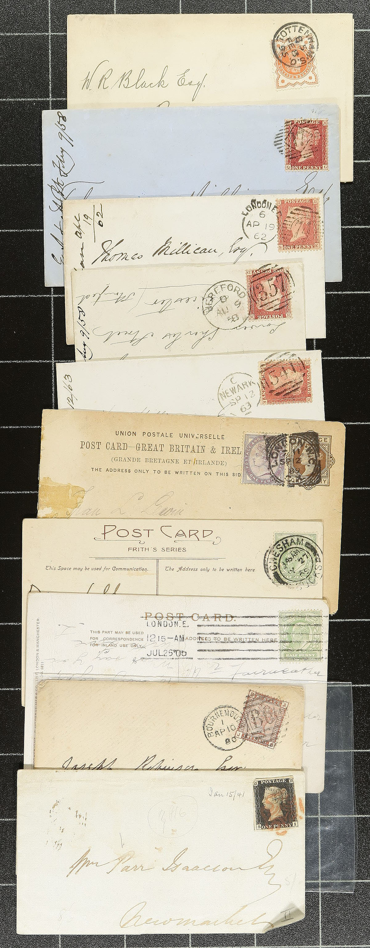 A fascinating clutch of 150 First Day Covers, show / event covers and commercial covers, with some postal stationery from Great Britain, Guernsey and Jersey. Starts with a (damaged) "Penny Black" on a large cover fragment from January 1841 and four pre-#33 "Penny Red" covers. There is a group of commercial and first day covers of the Guernsey occupation issues, the British first day covers are generally cacheted, with some potentially better issued between the 1953 Coronation and the early 1970’s. Noted a £5 Machin and some nice commemorative cancels. Perhaps the most intriguing item is a £5 Traveler’s Check from 1922 for the Bank of Montreal, London with both Canadian and British revenue stamps. Didn’t see anything after 1980. Estimate =