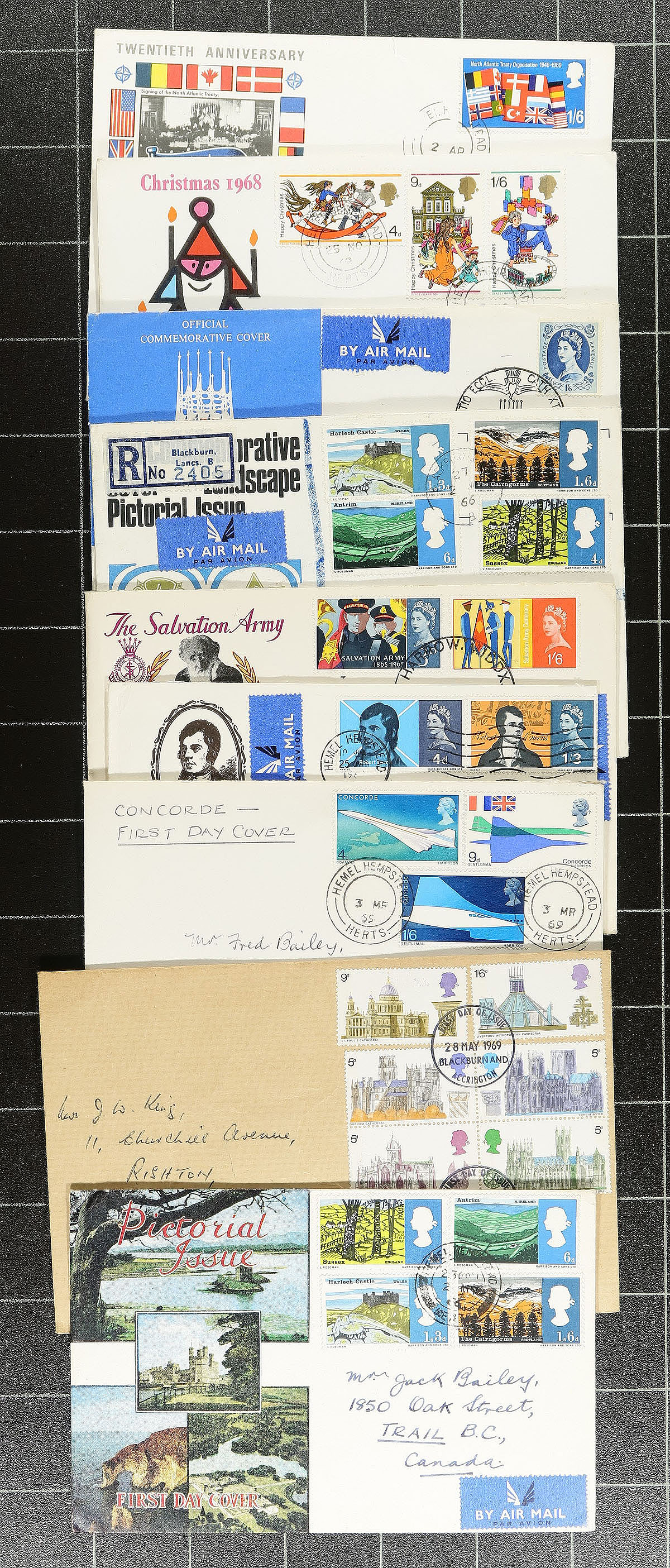 A fascinating clutch of 150 First Day Covers, show / event covers and commercial covers, with some postal stationery from Great Britain, Guernsey and Jersey. Starts with a (damaged) "Penny Black" on a large cover fragment from January 1841 and four pre-#33 "Penny Red" covers. There is a group of commercial and first day covers of the Guernsey occupation issues, the British first day covers are generally cacheted, with some potentially better issued between the 1953 Coronation and the early 1970’s. Noted a £5 Machin and some nice commemorative cancels. Perhaps the most intriguing item is a £5 Traveler’s Check from 1922 for the Bank of Montreal, London with both Canadian and British revenue stamps. Didn’t see anything after 1980. Estimate =