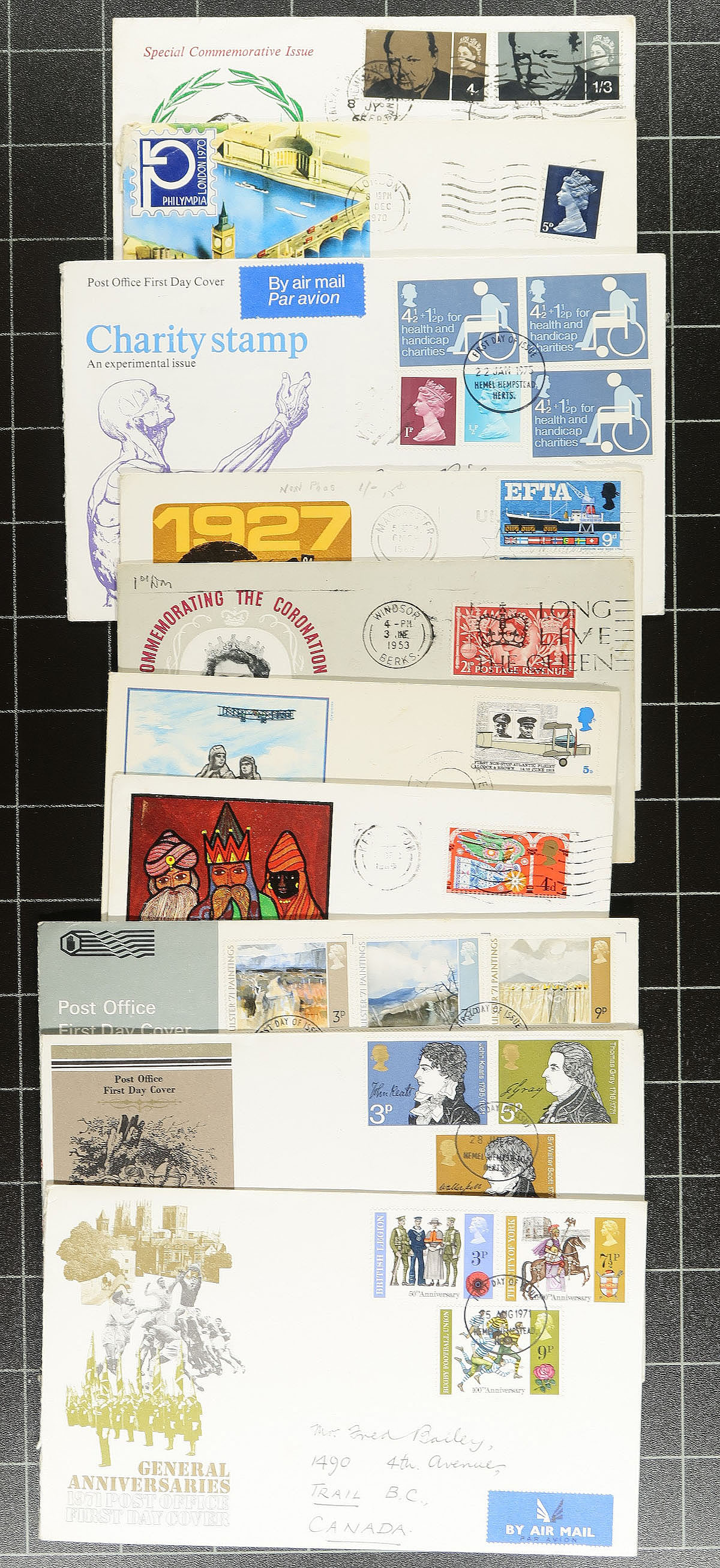 A fascinating clutch of 150 First Day Covers, show / event covers and commercial covers, with some postal stationery from Great Britain, Guernsey and Jersey. Starts with a (damaged) "Penny Black" on a large cover fragment from January 1841 and four pre-#33 "Penny Red" covers. There is a group of commercial and first day covers of the Guernsey occupation issues, the British first day covers are generally cacheted, with some potentially better issued between the 1953 Coronation and the early 1970’s. Noted a £5 Machin and some nice commemorative cancels. Perhaps the most intriguing item is a £5 Traveler’s Check from 1922 for the Bank of Montreal, London with both Canadian and British revenue stamps. Didn’t see anything after 1980. Estimate =