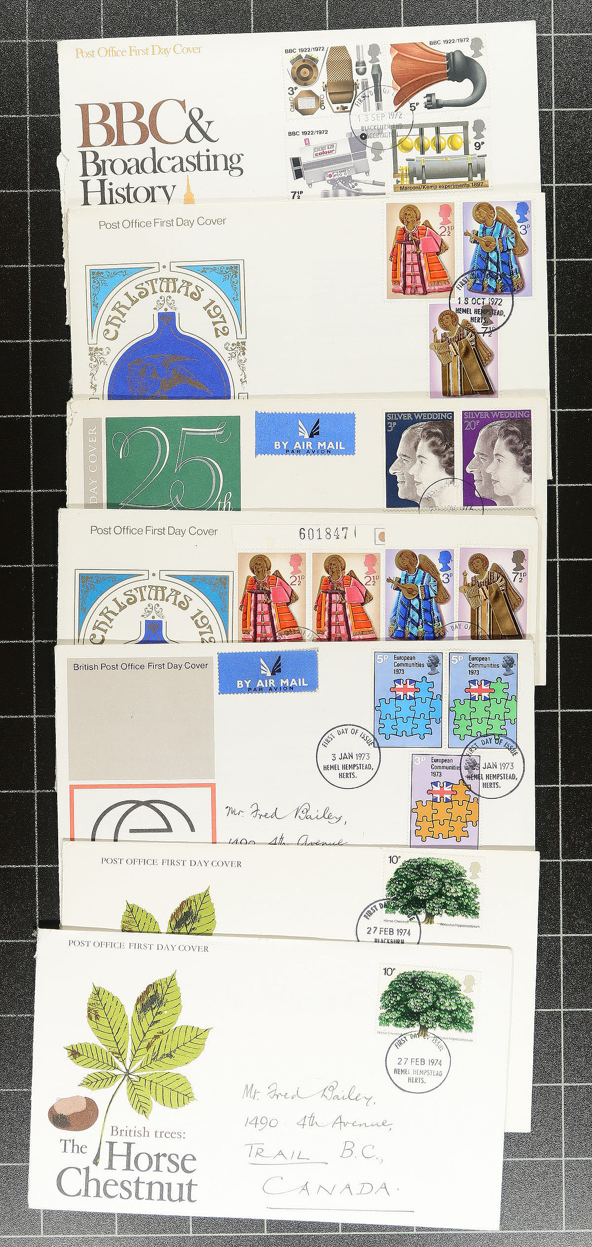 A fascinating clutch of 150 First Day Covers, show / event covers and commercial covers, with some postal stationery from Great Britain, Guernsey and Jersey. Starts with a (damaged) "Penny Black" on a large cover fragment from January 1841 and four pre-#33 "Penny Red" covers. There is a group of commercial and first day covers of the Guernsey occupation issues, the British first day covers are generally cacheted, with some potentially better issued between the 1953 Coronation and the early 1970’s. Noted a £5 Machin and some nice commemorative cancels. Perhaps the most intriguing item is a £5 Traveler’s Check from 1922 for the Bank of Montreal, London with both Canadian and British revenue stamps. Didn’t see anything after 1980. Estimate =