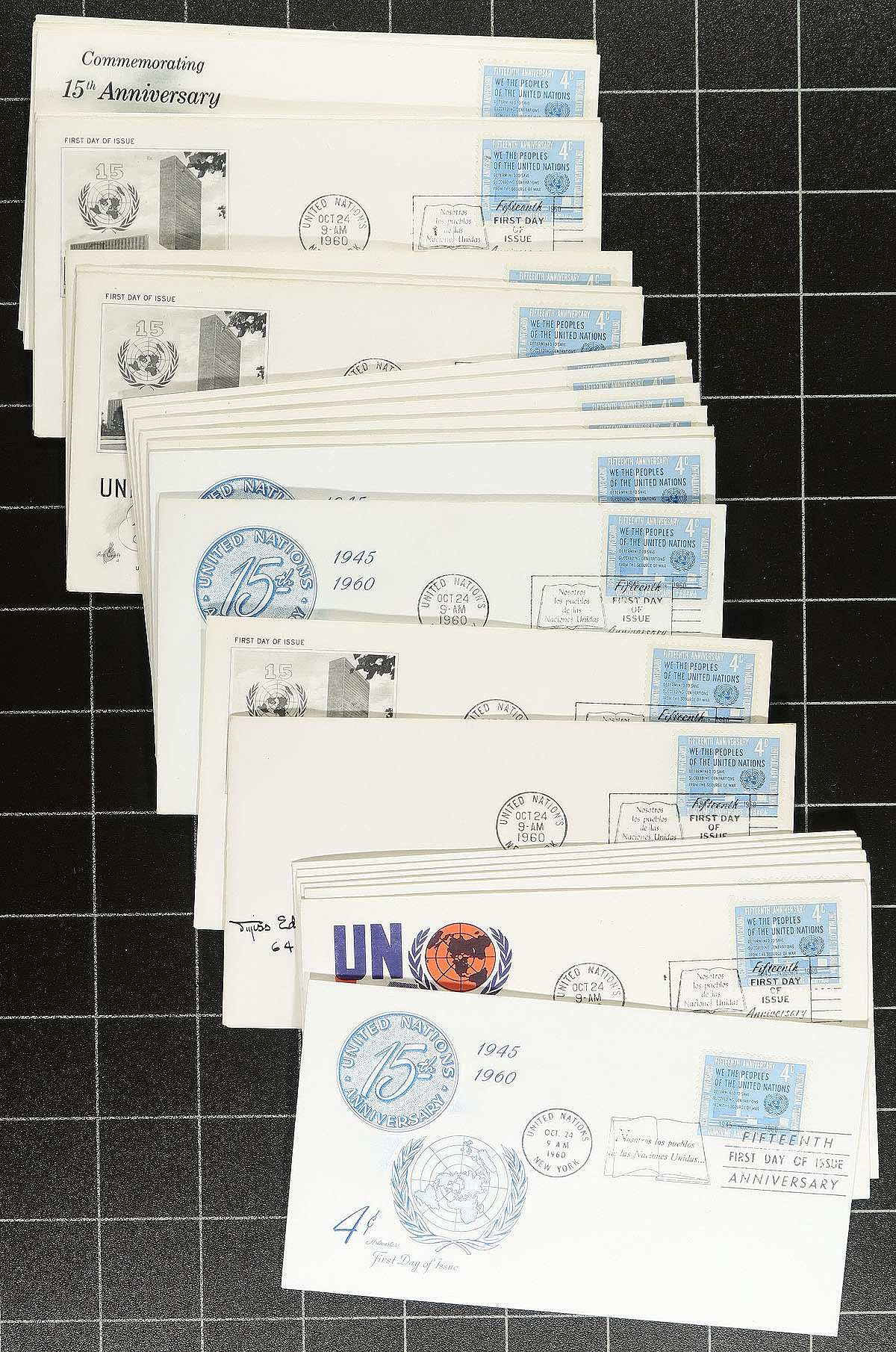 First Day Cover stock in three envelope boxes, with a nicely organized group of about 1200 covers. Includes a range of cachet makers (e.g. Artmaster, Artcraft, Fleetwood), as well as some unidentified. Many are unaddressed, a few are uncacheted. Includes up to about 20 of a type in places. A few have minor edge tone spots. Perfect for the collector looking to expand their UN FDC collection. Estimate =