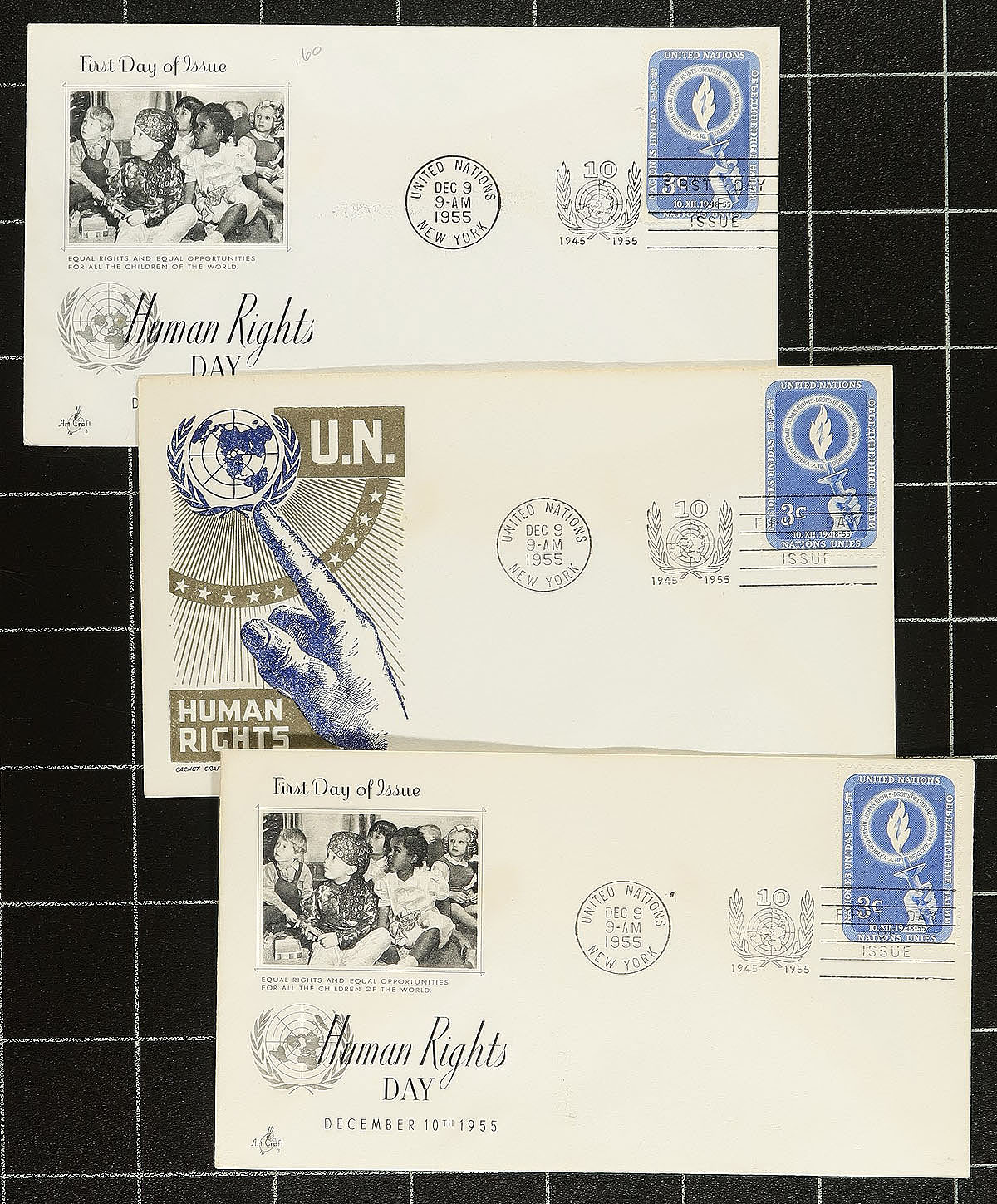 First Day Cover stock in three envelope boxes, with a nicely organized group of about 1200 covers. Includes a range of cachet makers (e.g. Artmaster, Artcraft, Fleetwood), as well as some unidentified. Many are unaddressed, a few are uncacheted. Includes up to about 20 of a type in places. A few have minor edge tone spots. Perfect for the collector looking to expand their UN FDC collection. Estimate =