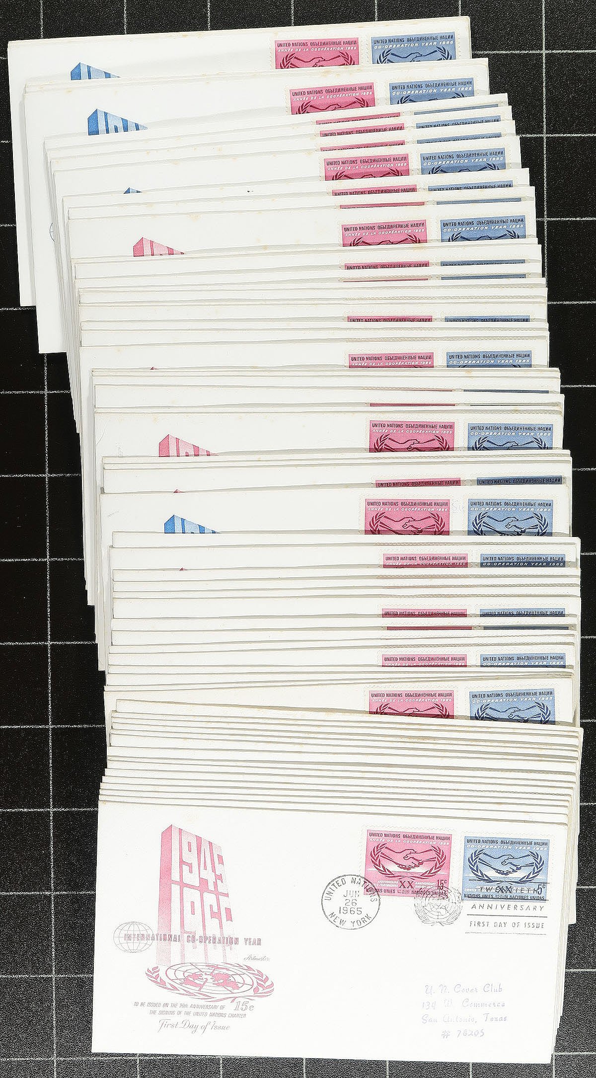 First Day Cover stock in three envelope boxes, with a nicely organized group of about 1200 covers. Includes a range of cachet makers (e.g. Artmaster, Artcraft, Fleetwood), as well as some unidentified. Many are unaddressed, a few are uncacheted. Includes up to about 20 of a type in places. A few have minor edge tone spots. Perfect for the collector looking to expand their UN FDC collection. Estimate =