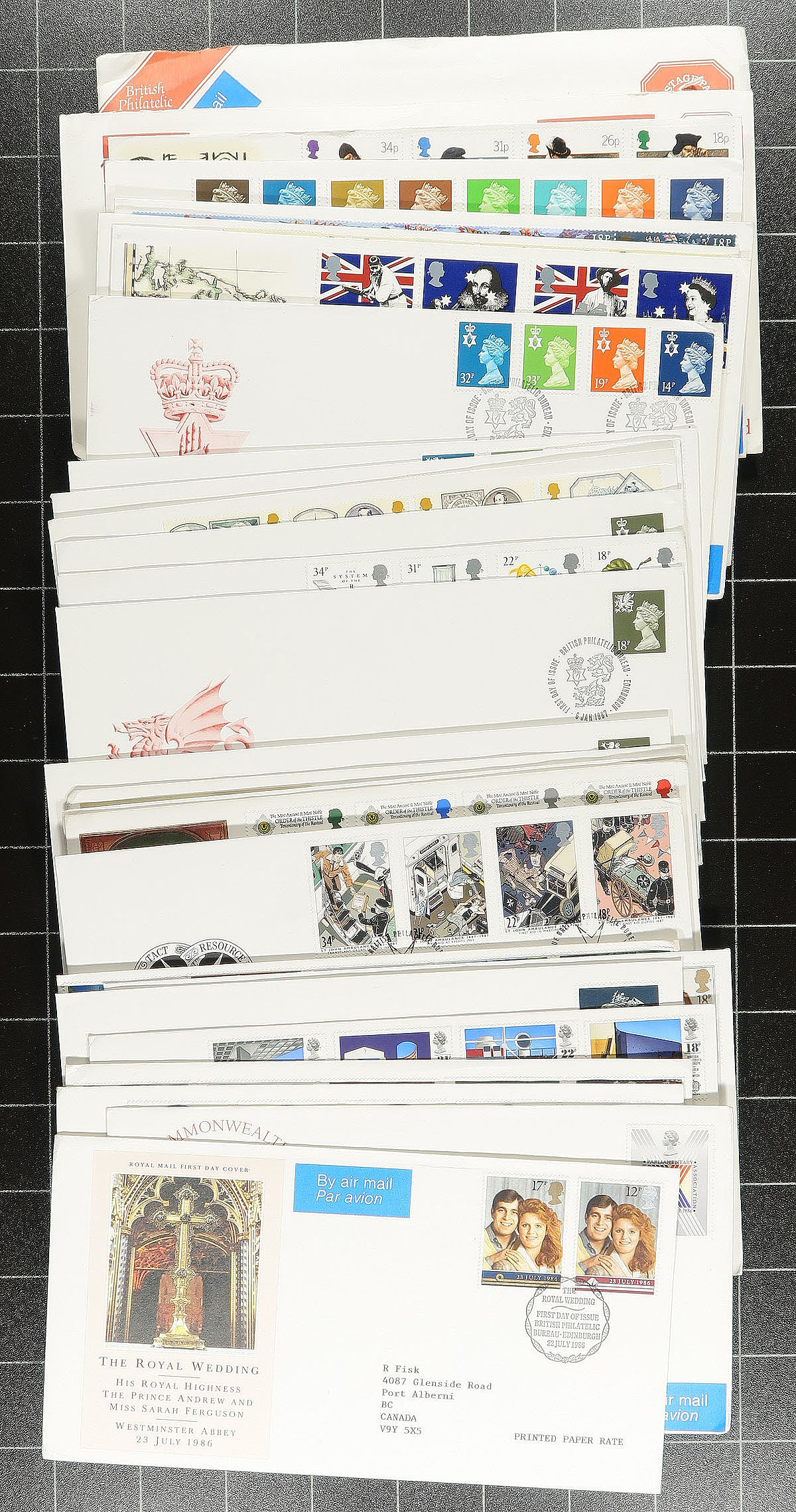 FDC Holding. Small tub filled with a few hundred primarily late 1970's to early 2000's British Post Office cachet First Day Covers, many of which are still in the original packaging as received from the British Philatelic Bureau and all addressed to the same collector here in British Columbia. Likely largely complete for the period of 1980-2000 but as these are quasi-organized and some un-opened packages, it is a bit hard to tell. Original cost would have easily been several hundred dollars. Estimate =