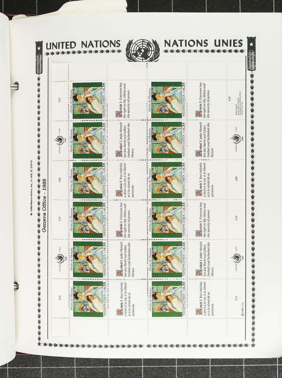 Mint collection from 1951 to 1997 mounted on 2-post Minkus pages in a burgundy binder. Very complete, the only obvious omission is the first souvenir sheet, but the collection runs up to the Terra Cotta soldiers - World Heritage Prestige Booklet. Includes New York, Geneva and Vienna issues, including more recent issues where all three offices issued similar stamps. The original face value of the stamps was US$393.00 (NY), SF378.00 (Geneva), AS3300.00 (Vienna), which explains the owner’s (slightly older) total Scott catalogue value US$2137.00. The stamps are mostly hinged. Estimate =