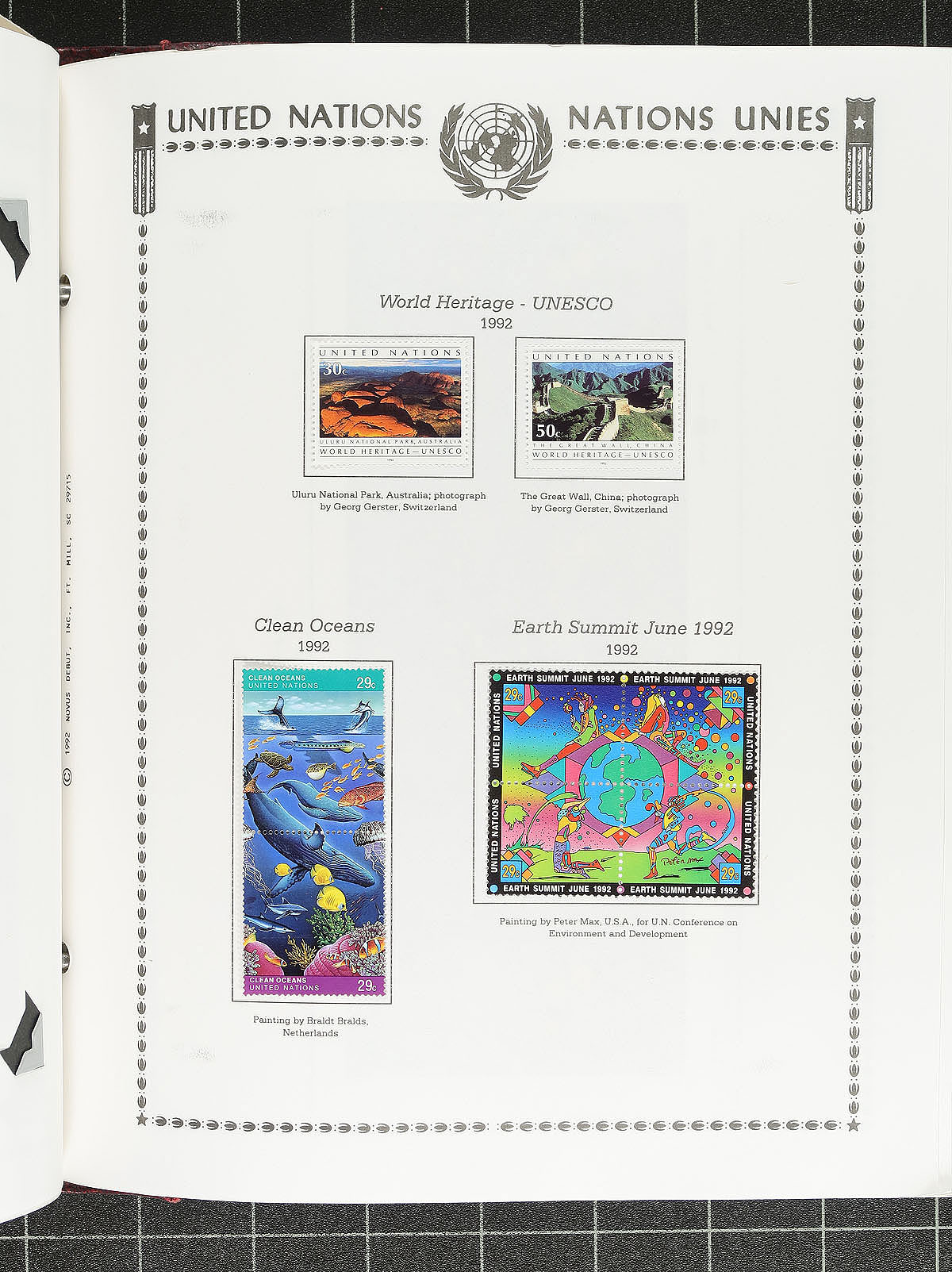 Mint collection from 1951 to 1997 mounted on 2-post Minkus pages in a burgundy binder. Very complete, the only obvious omission is the first souvenir sheet, but the collection runs up to the Terra Cotta soldiers - World Heritage Prestige Booklet. Includes New York, Geneva and Vienna issues, including more recent issues where all three offices issued similar stamps. The original face value of the stamps was US$393.00 (NY), SF378.00 (Geneva), AS3300.00 (Vienna), which explains the owner’s (slightly older) total Scott catalogue value US$2137.00. The stamps are mostly hinged. Estimate =