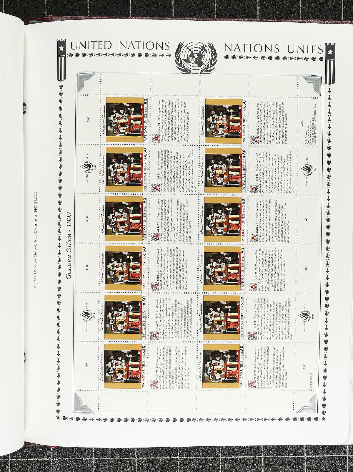 Mint collection from 1951 to 1997 mounted on 2-post Minkus pages in a burgundy binder. Very complete, the only obvious omission is the first souvenir sheet, but the collection runs up to the Terra Cotta soldiers - World Heritage Prestige Booklet. Includes New York, Geneva and Vienna issues, including more recent issues where all three offices issued similar stamps. The original face value of the stamps was US$393.00 (NY), SF378.00 (Geneva), AS3300.00 (Vienna), which explains the owner’s (slightly older) total Scott catalogue value US$2137.00. The stamps are mostly hinged. Estimate =
