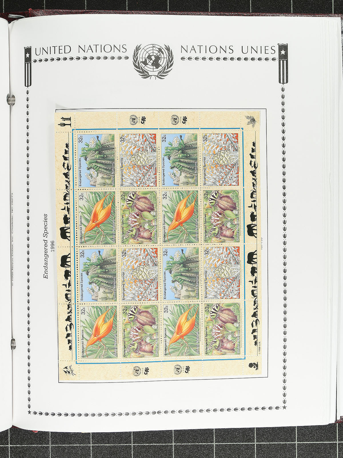 Mint collection from 1951 to 1997 mounted on 2-post Minkus pages in a burgundy binder. Very complete, the only obvious omission is the first souvenir sheet, but the collection runs up to the Terra Cotta soldiers - World Heritage Prestige Booklet. Includes New York, Geneva and Vienna issues, including more recent issues where all three offices issued similar stamps. The original face value of the stamps was US$393.00 (NY), SF378.00 (Geneva), AS3300.00 (Vienna), which explains the owner’s (slightly older) total Scott catalogue value US$2137.00. The stamps are mostly hinged. Estimate =