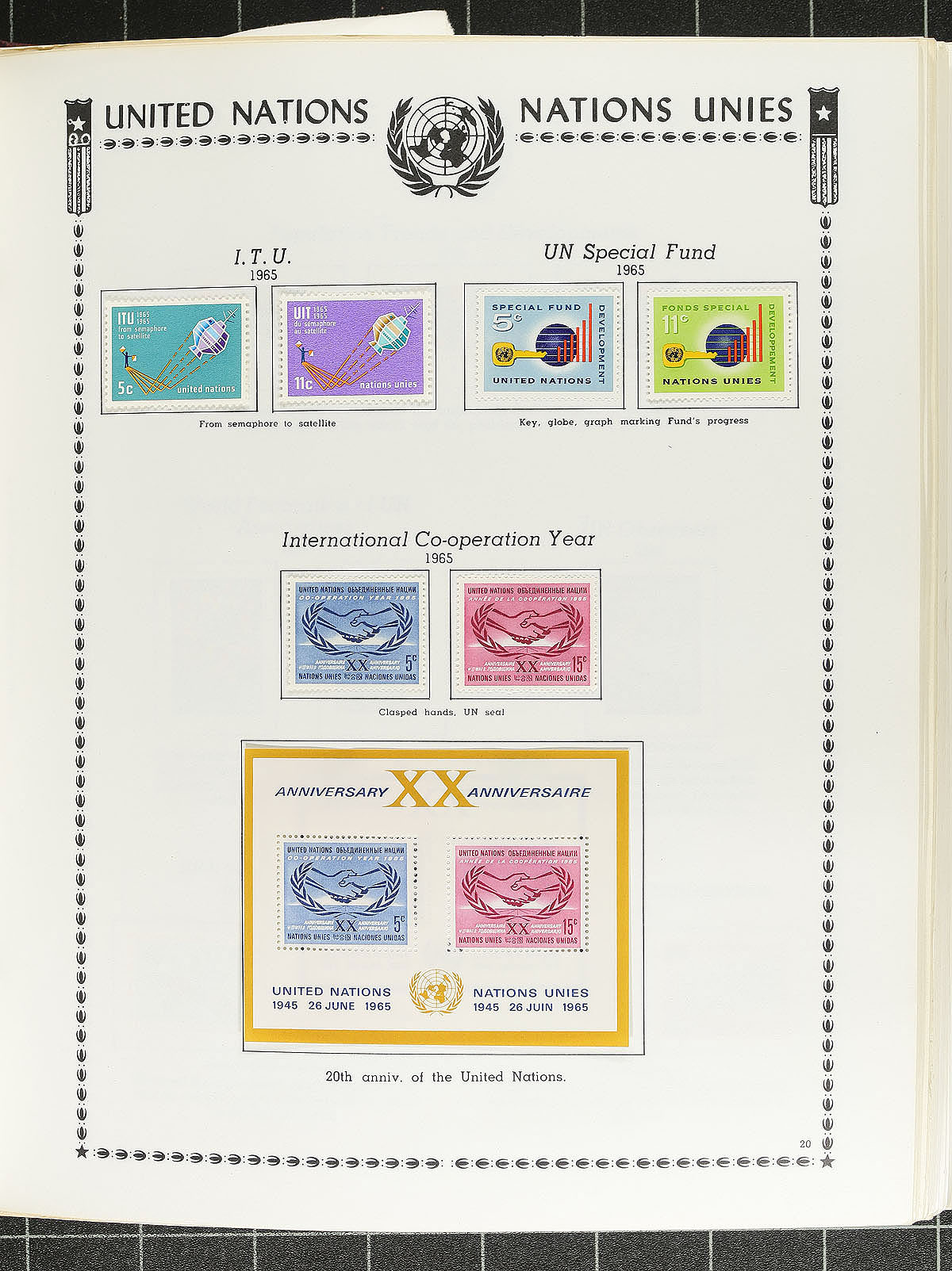 Mint collection from 1951 to 1997 mounted on 2-post Minkus pages in a burgundy binder. Very complete, the only obvious omission is the first souvenir sheet, but the collection runs up to the Terra Cotta soldiers - World Heritage Prestige Booklet. Includes New York, Geneva and Vienna issues, including more recent issues where all three offices issued similar stamps. The original face value of the stamps was US$393.00 (NY), SF378.00 (Geneva), AS3300.00 (Vienna), which explains the owner’s (slightly older) total Scott catalogue value US$2137.00. The stamps are mostly hinged. Estimate =