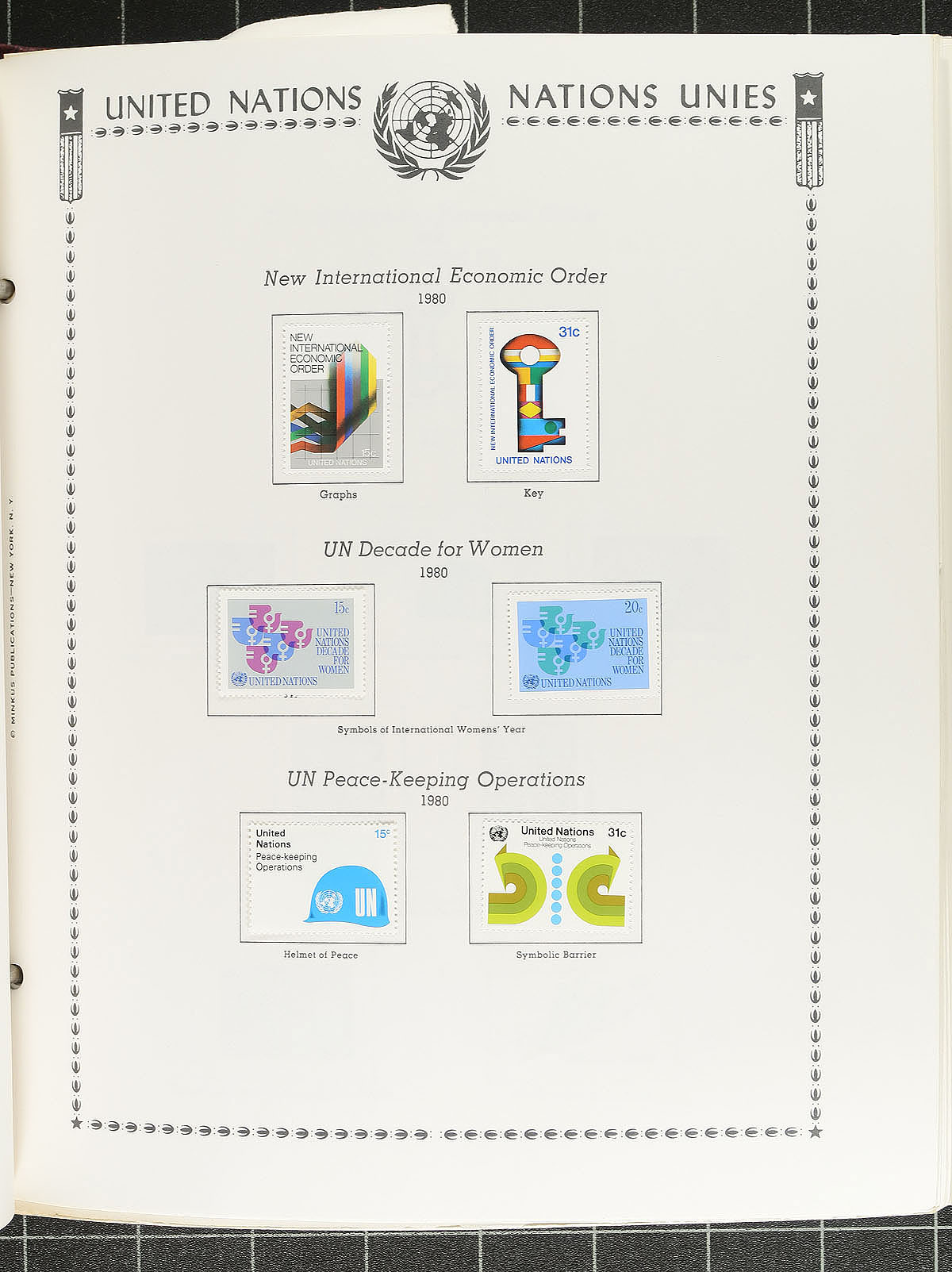 Mint collection from 1951 to 1997 mounted on 2-post Minkus pages in a burgundy binder. Very complete, the only obvious omission is the first souvenir sheet, but the collection runs up to the Terra Cotta soldiers - World Heritage Prestige Booklet. Includes New York, Geneva and Vienna issues, including more recent issues where all three offices issued similar stamps. The original face value of the stamps was US$393.00 (NY), SF378.00 (Geneva), AS3300.00 (Vienna), which explains the owner’s (slightly older) total Scott catalogue value US$2137.00. The stamps are mostly hinged. Estimate =