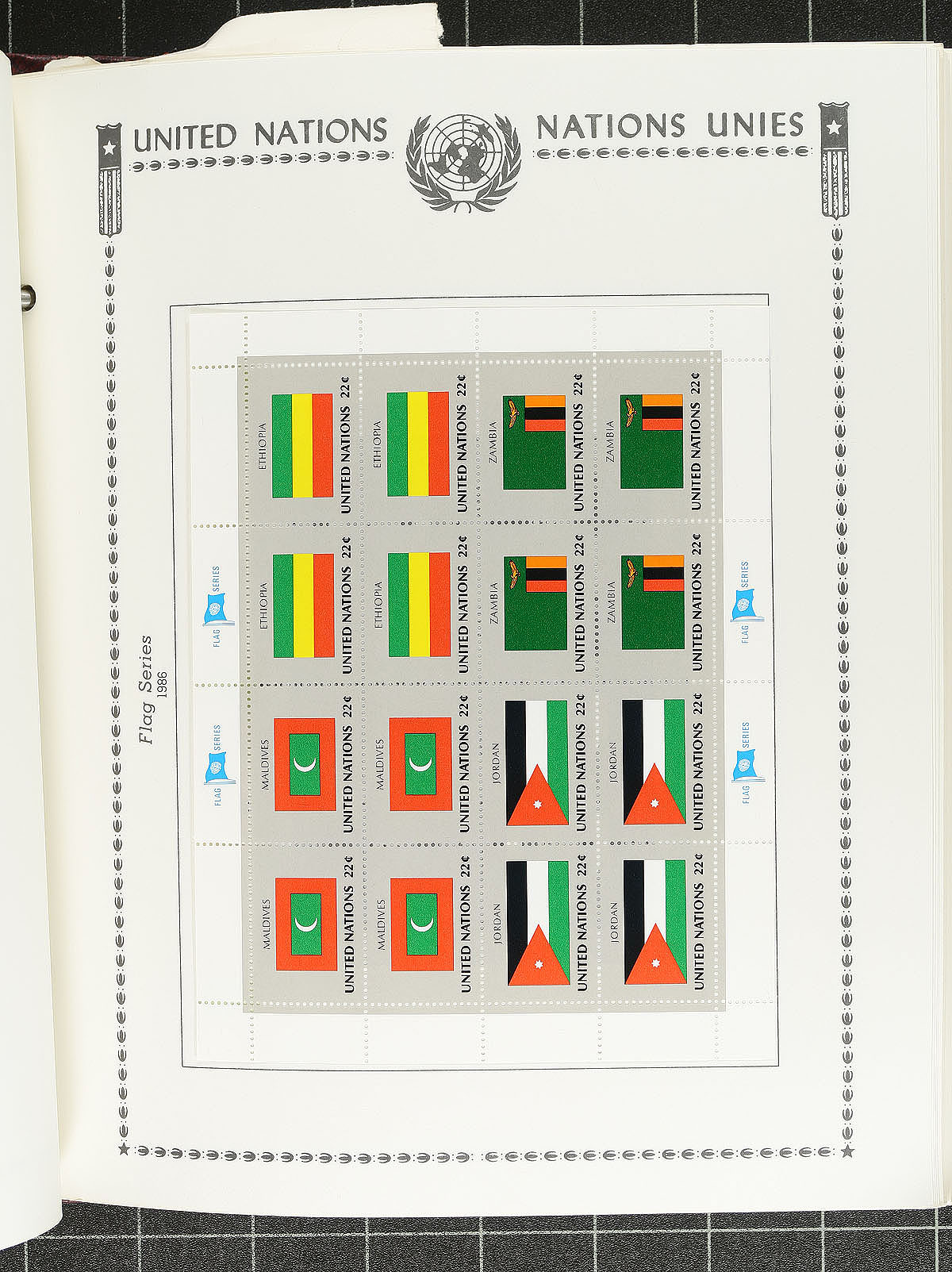 Mint collection from 1951 to 1997 mounted on 2-post Minkus pages in a burgundy binder. Very complete, the only obvious omission is the first souvenir sheet, but the collection runs up to the Terra Cotta soldiers - World Heritage Prestige Booklet. Includes New York, Geneva and Vienna issues, including more recent issues where all three offices issued similar stamps. The original face value of the stamps was US$393.00 (NY), SF378.00 (Geneva), AS3300.00 (Vienna), which explains the owner’s (slightly older) total Scott catalogue value US$2137.00. The stamps are mostly hinged. Estimate =