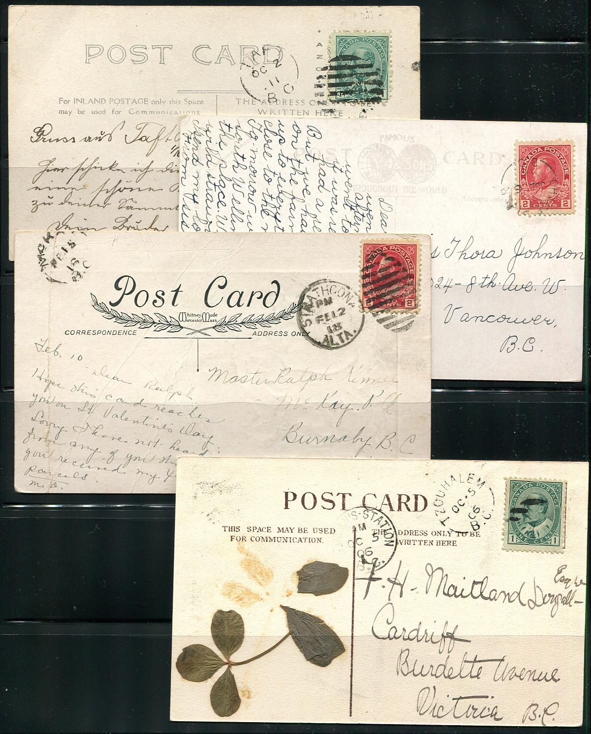 British Columbia Postal History. A quartet of better BC split ring cancels 1906-1918 on postcards. Includes Taft 1911, Chase River 1916, McKay 1918 and Tzouhalem 1906. A nice chance to knock off a few of the tougher BC Post Office cancels. Estimate =