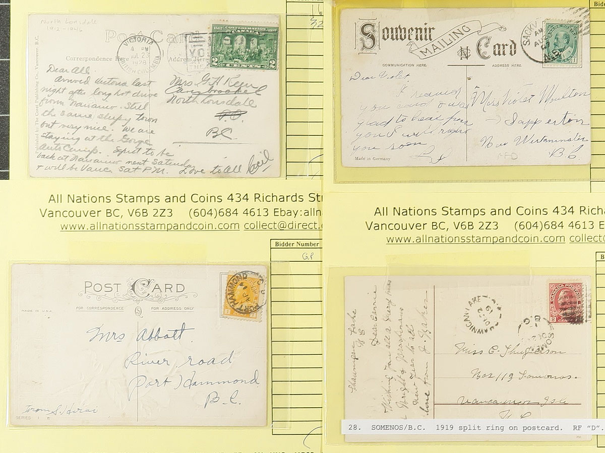 British Columbia Postal History Potpourri. A wild ride of BC postmarks, with 38 covers and postcards with Split Ring, CDS and Duplex type postmarks. The majority still on the original auction card from when purchased by the collector. A few notable items are Ryan 1908 split ring on CPR Railway cover, Phoenix 1919 CDS incoming cover, Coal Harbour 1943 CDS cover, Gateway 1914 split ring postcard etc. Includes on "non-BC", which is a Mountain House AB 1923 split ring postcards (P.O. open 1905-1925 only). Estimate =