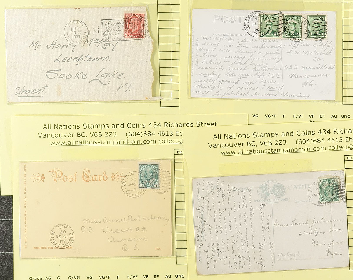 British Columbia Postal History Potpourri. A wild ride of BC postmarks, with 38 covers and postcards with Split Ring, CDS and Duplex type postmarks. The majority still on the original auction card from when purchased by the collector. A few notable items are Ryan 1908 split ring on CPR Railway cover, Phoenix 1919 CDS incoming cover, Coal Harbour 1943 CDS cover, Gateway 1914 split ring postcard etc. Includes on "non-BC", which is a Mountain House AB 1923 split ring postcards (P.O. open 1905-1925 only). Estimate =