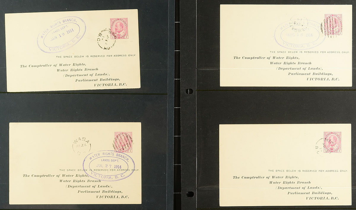 British Columbia Postal History Potpourri. A wild ride of BC postmarks, with 38 covers and postcards with Split Ring, CDS and Duplex type postmarks. The majority still on the original auction card from when purchased by the collector. A few notable items are Ryan 1908 split ring on CPR Railway cover, Phoenix 1919 CDS incoming cover, Coal Harbour 1943 CDS cover, Gateway 1914 split ring postcard etc. Includes on "non-BC", which is a Mountain House AB 1923 split ring postcards (P.O. open 1905-1925 only). Estimate =
