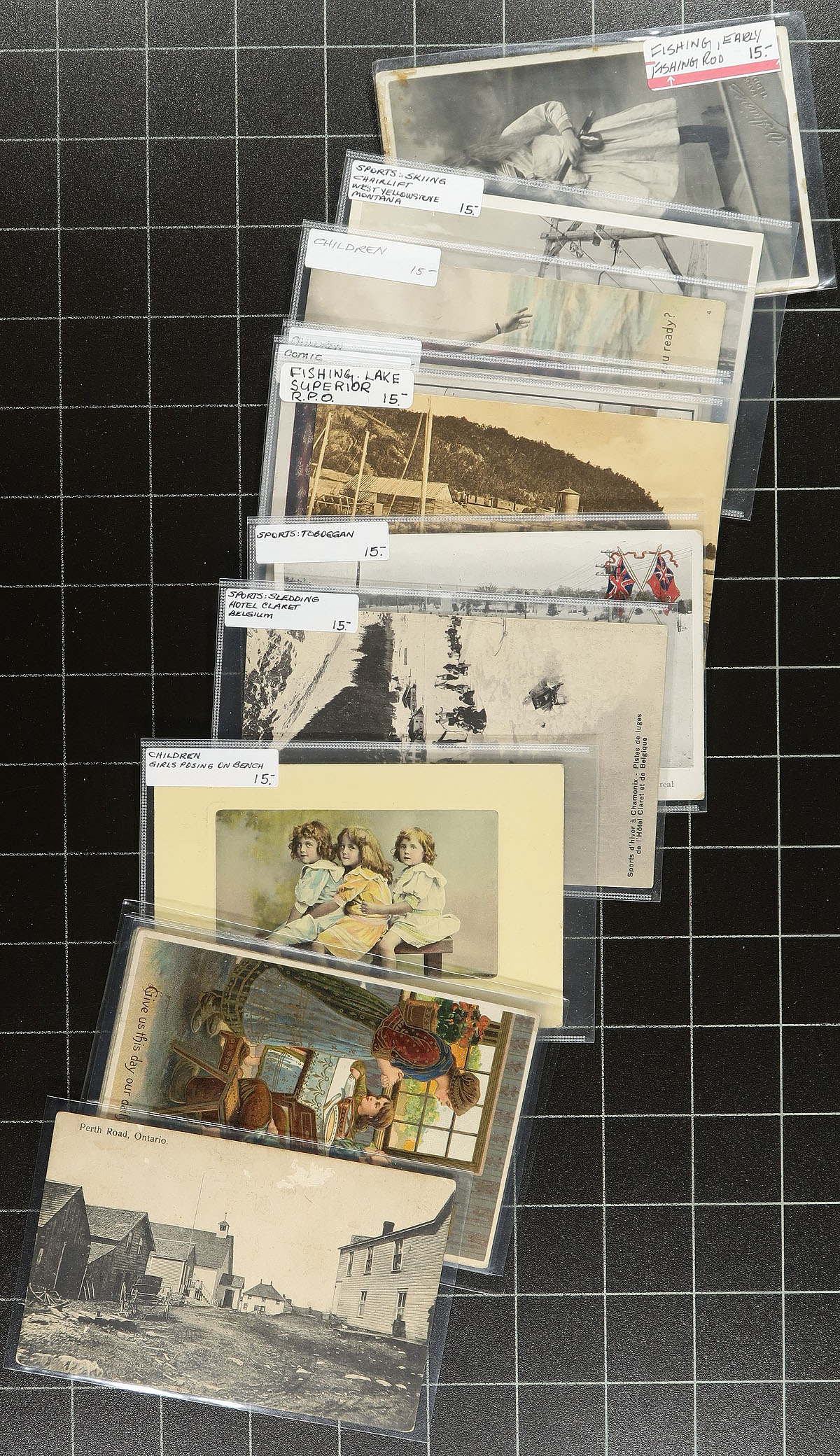 Postcard Estate Offering. Cardboard "dealer show box", filled with postcards (and a few covers), with seemingly not much "rhyme or reason", but with some strength in Europe, USA, greetings and even a pack of "National Museum Ottawa" Bird postcards. Offered as part of an estate of a postcard dealer, these being "works in progress". Likely 400-500 items in total. Estimate =