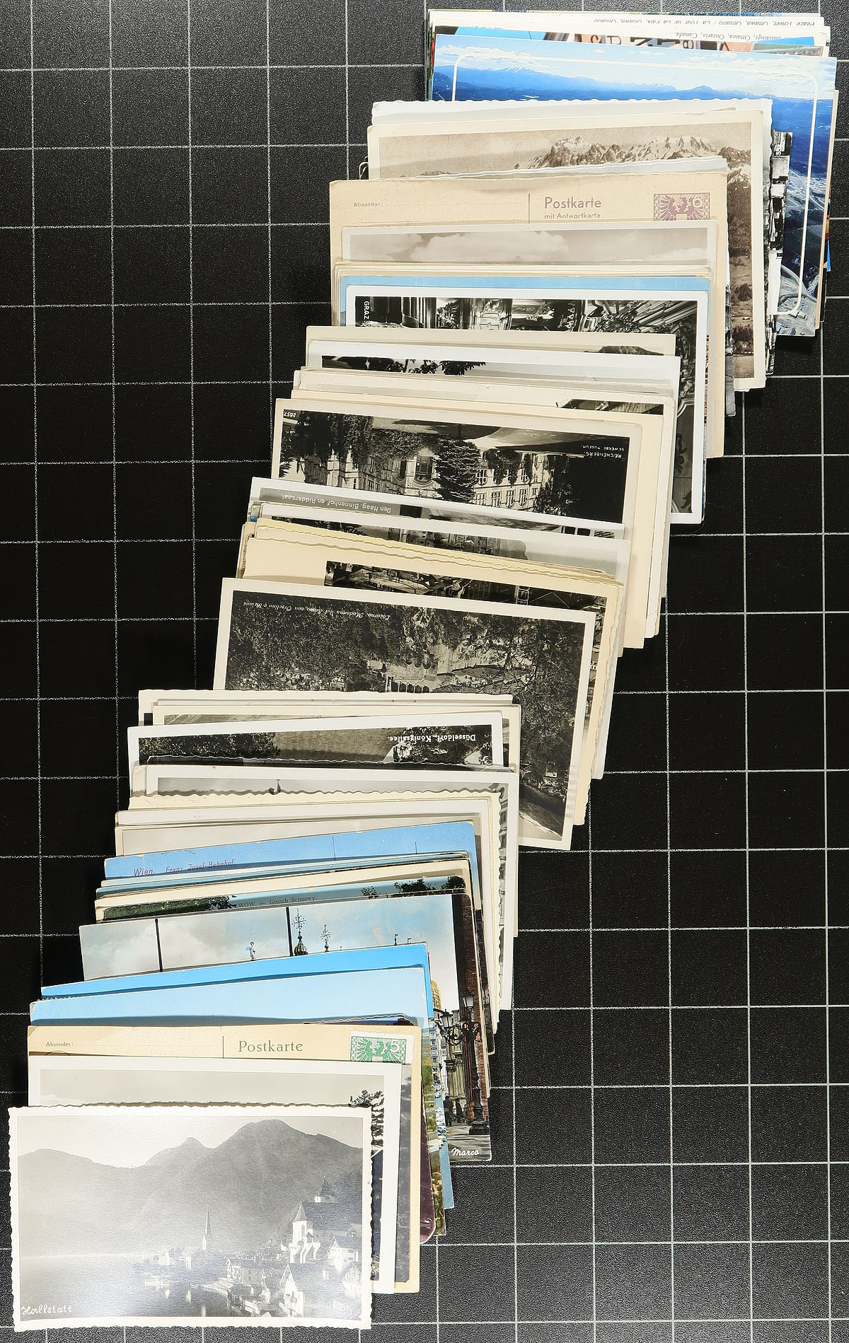Postcard Estate Offering. Cardboard "dealer show box", filled with postcards (and a few covers), with seemingly not much "rhyme or reason", but with some strength in Europe, USA, greetings and even a pack of "National Museum Ottawa" Bird postcards. Offered as part of an estate of a postcard dealer, these being "works in progress". Likely 400-500 items in total. Estimate =