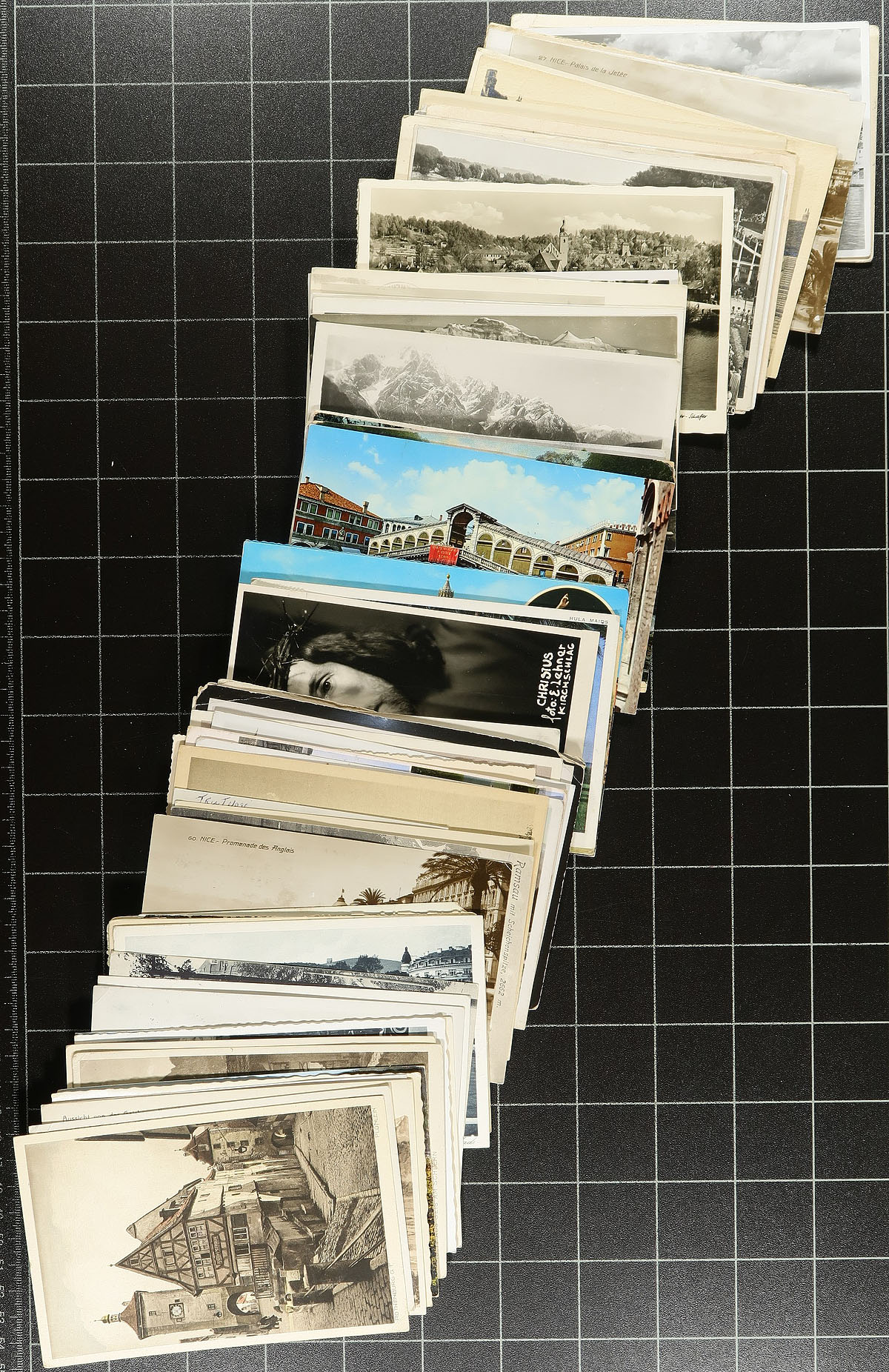 Postcard Estate Offering. Cardboard "dealer show box", filled with postcards (and a few covers), with seemingly not much "rhyme or reason", but with some strength in Europe, USA, greetings and even a pack of "National Museum Ottawa" Bird postcards. Offered as part of an estate of a postcard dealer, these being "works in progress". Likely 400-500 items in total. Estimate =