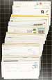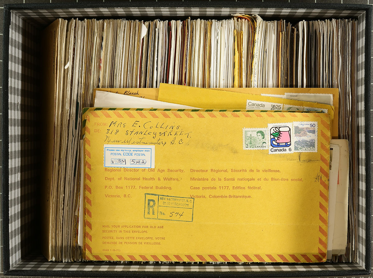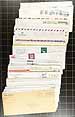 British Columbia Postmark Hoard #1. The first of three felt / cloth boxes (about the size of shoebox) containing approximately 400 covers with BC postmarks. Primarily QEII era covers, with earlier items mixed in throughout. A wealth of postmarks here, selected for (primarily) hand cancels. Strength in this box is registered rates, along with modern RC (retail centre) or POCON cancels. Well worth the estimate of 50c per cover. Estimate =