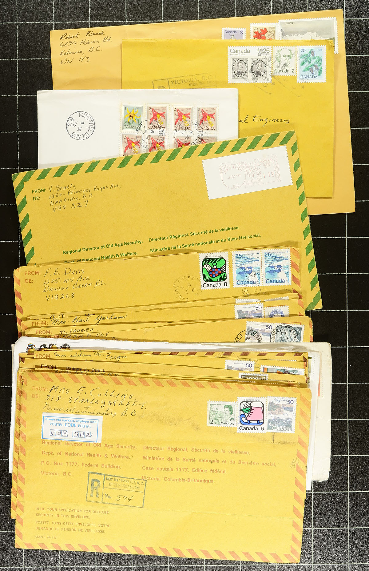 British Columbia Postmark Hoard #1. The first of three felt / cloth boxes (about the size of shoebox) containing approximately 400 covers with BC postmarks. Primarily QEII era covers, with earlier items mixed in throughout. A wealth of postmarks here, selected for (primarily) hand cancels. Strength in this box is registered rates, along with modern RC (retail centre) or POCON cancels. Well worth the estimate of 50c per cover. Estimate =