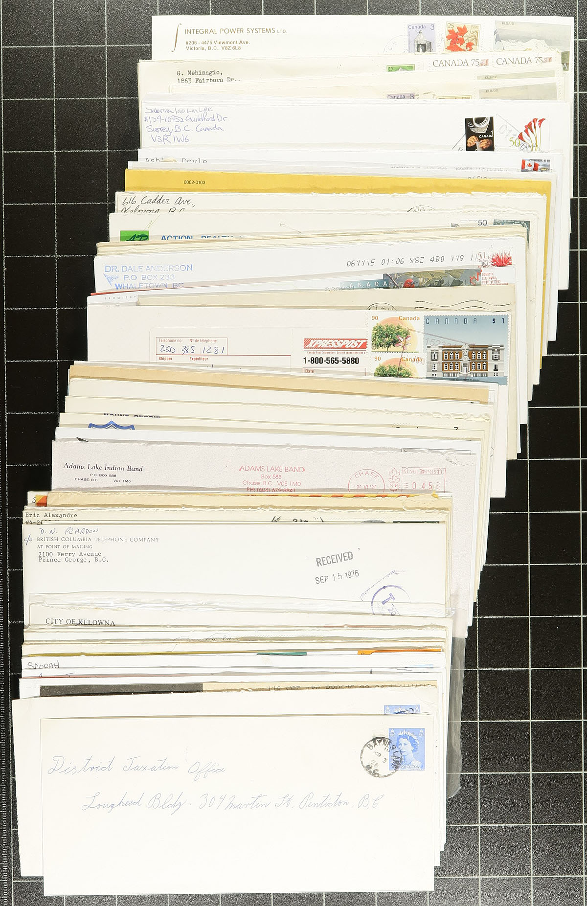 British Columbia Postmark Hoard #1. The first of three felt / cloth boxes (about the size of shoebox) containing approximately 400 covers with BC postmarks. Primarily QEII era covers, with earlier items mixed in throughout. A wealth of postmarks here, selected for (primarily) hand cancels. Strength in this box is registered rates, along with modern RC (retail centre) or POCON cancels. Well worth the estimate of 50c per cover. Estimate =