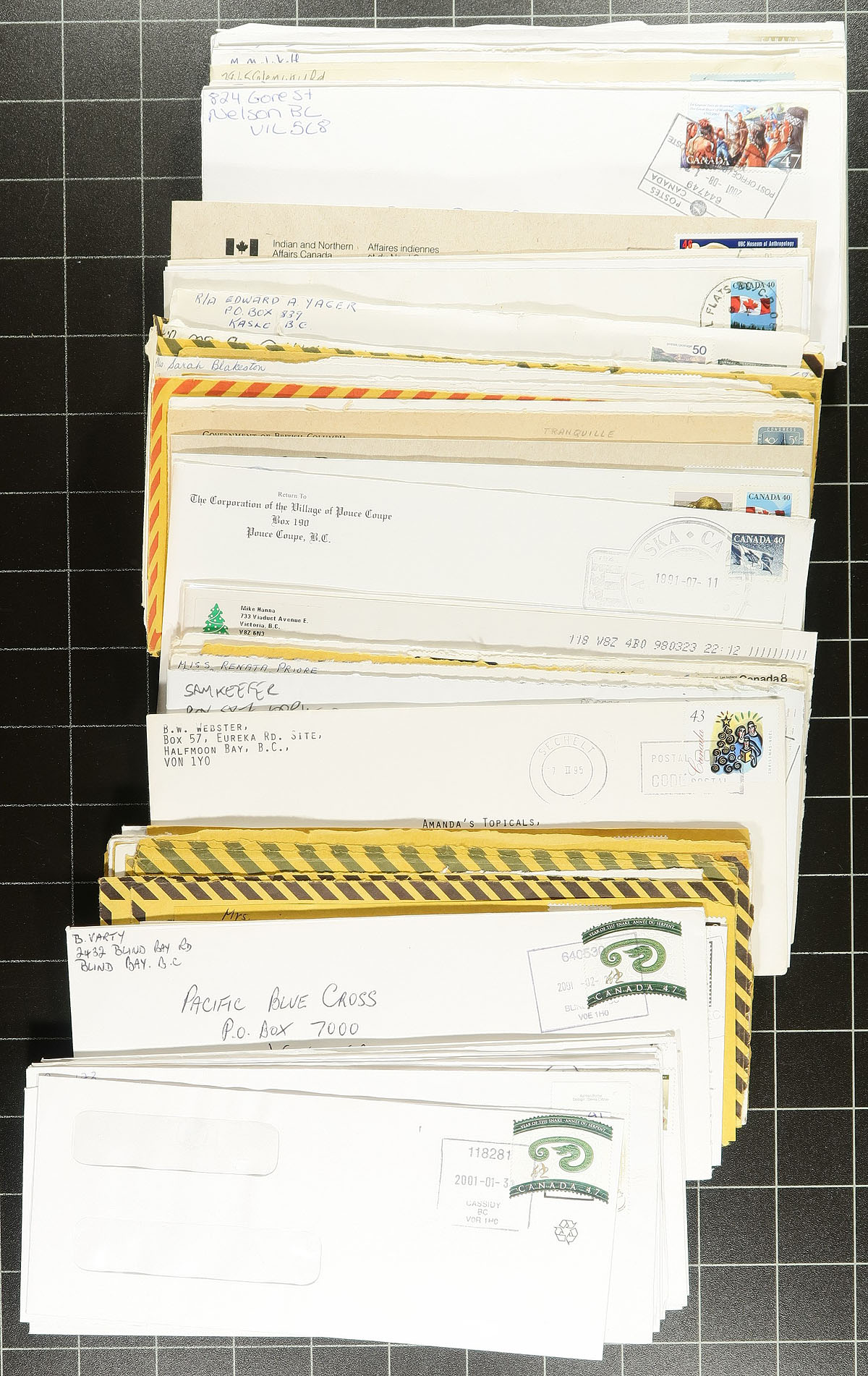 British Columbia Postmark Hoard #1. The first of three felt / cloth boxes (about the size of shoebox) containing approximately 400 covers with BC postmarks. Primarily QEII era covers, with earlier items mixed in throughout. A wealth of postmarks here, selected for (primarily) hand cancels. Strength in this box is registered rates, along with modern RC (retail centre) or POCON cancels. Well worth the estimate of 50c per cover. Estimate =