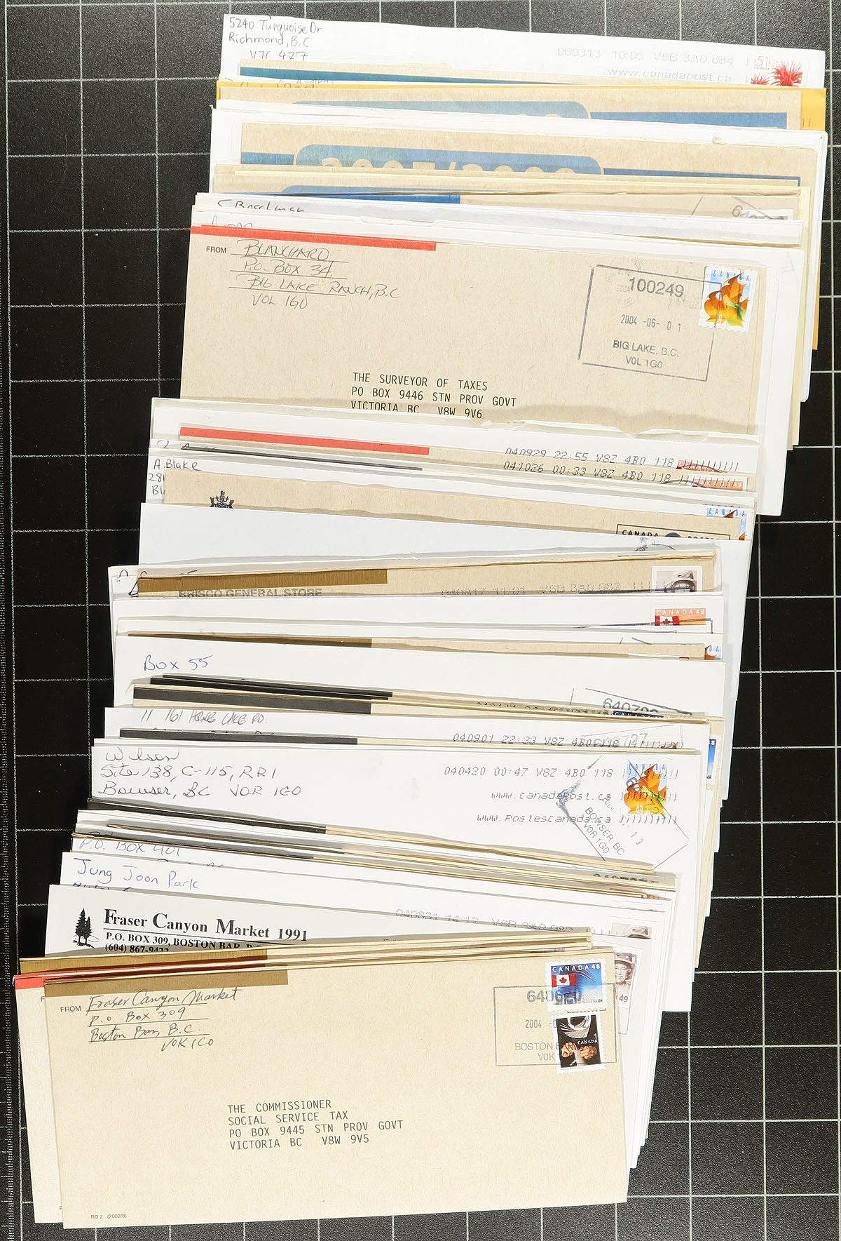 British Columbia Postmark Hoard #1. The first of three felt / cloth boxes (about the size of shoebox) containing approximately 400 covers with BC postmarks. Primarily QEII era covers, with earlier items mixed in throughout. A wealth of postmarks here, selected for (primarily) hand cancels. Strength in this box is registered rates, along with modern RC (retail centre) or POCON cancels. Well worth the estimate of 50c per cover. Estimate =