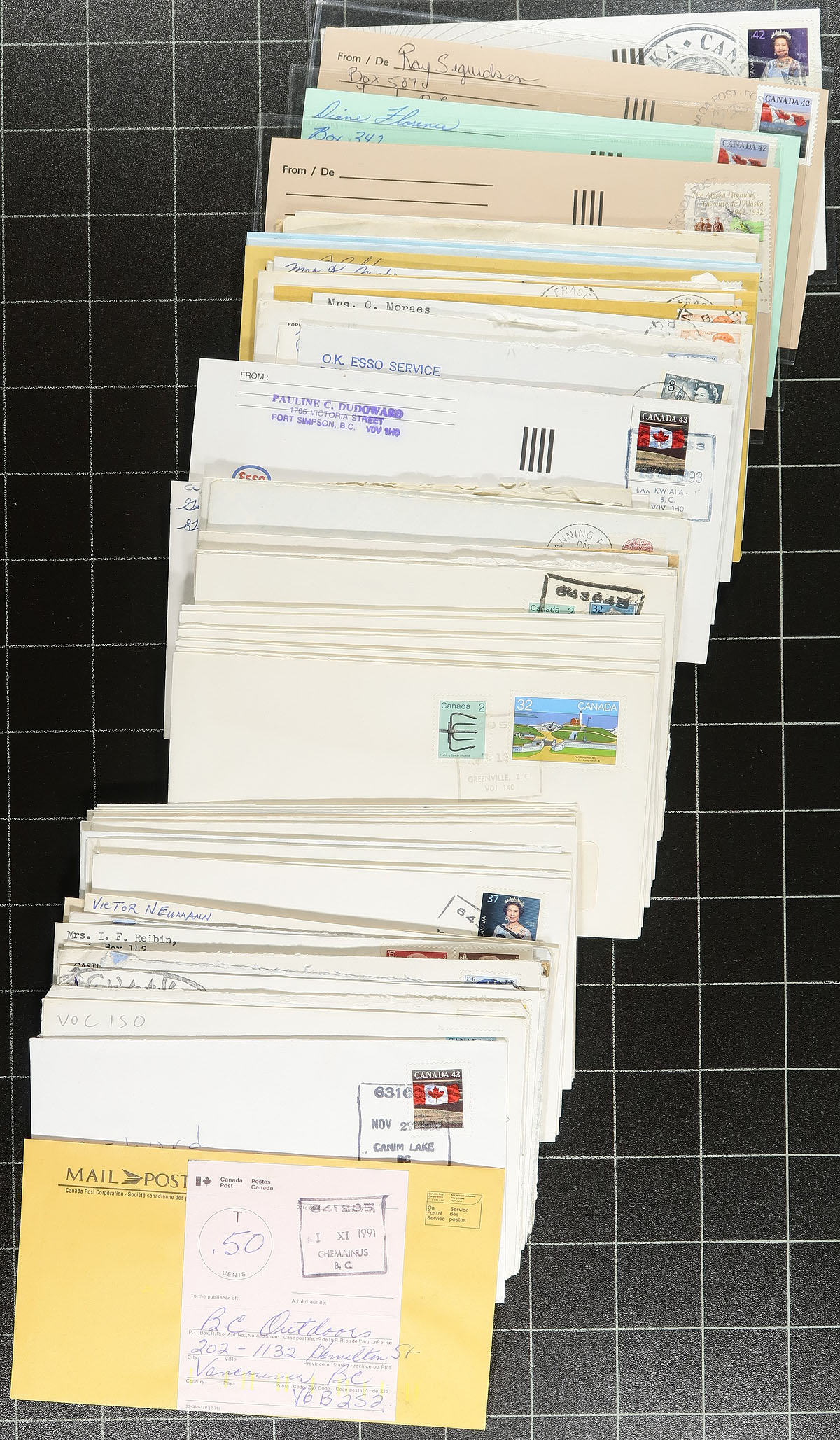 British Columbia Postmark Hoard #2. The second of three felt / cloth boxes (about the size of shoebox) containing approximately 400 covers with BC postmarks. Primarily QEII era covers, with earlier items mixed in throughout. A wealth of postmarks here, selected for (primarily) hand cancels (split ring, CDS, POCON, Retail Centre, machine). Well worth the estimate of 50c per cover. Estimate =