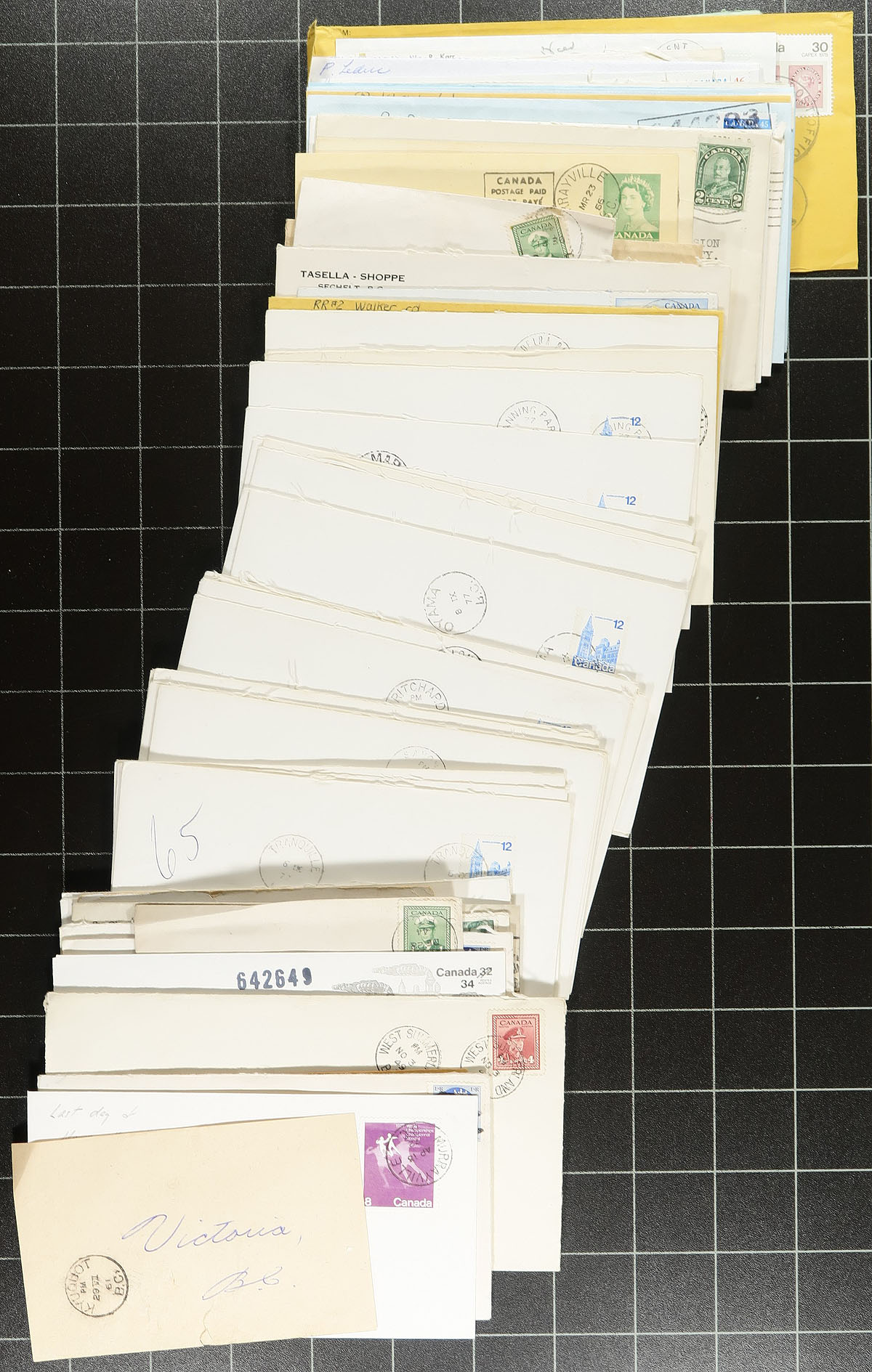 British Columbia Postmark Hoard #3. The third and final of the cloth boxes (about the size of shoebox) containing approximately 400 covers with BC postmarks. Primarily QEII era covers, with earlier items mixed in throughout. Again, the strength is in the wealth of postmarks here, selected for (primarily) hand cancels (split ring, CDS, POCON, Retail Centre, machine). Well worth the estimate of 50c per cover. Estimate =