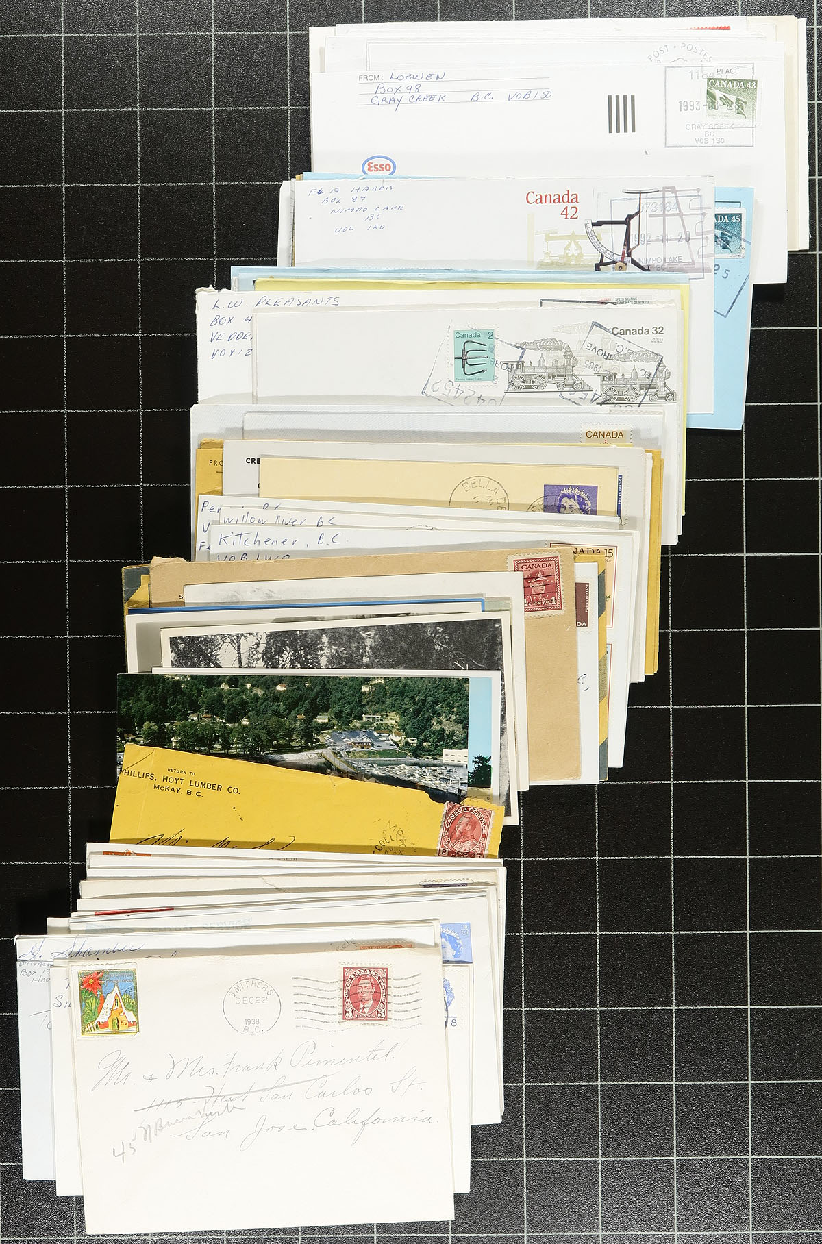 British Columbia Postmark Hoard #3. The third and final of the cloth boxes (about the size of shoebox) containing approximately 400 covers with BC postmarks. Primarily QEII era covers, with earlier items mixed in throughout. Again, the strength is in the wealth of postmarks here, selected for (primarily) hand cancels (split ring, CDS, POCON, Retail Centre, machine). Well worth the estimate of 50c per cover. Estimate =