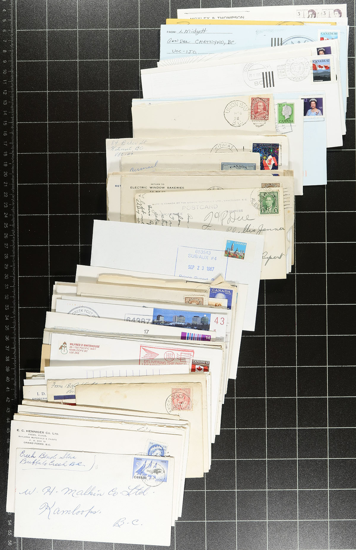 British Columbia Postmark Hoard #3. The third and final of the cloth boxes (about the size of shoebox) containing approximately 400 covers with BC postmarks. Primarily QEII era covers, with earlier items mixed in throughout. Again, the strength is in the wealth of postmarks here, selected for (primarily) hand cancels (split ring, CDS, POCON, Retail Centre, machine). Well worth the estimate of 50c per cover. Estimate =