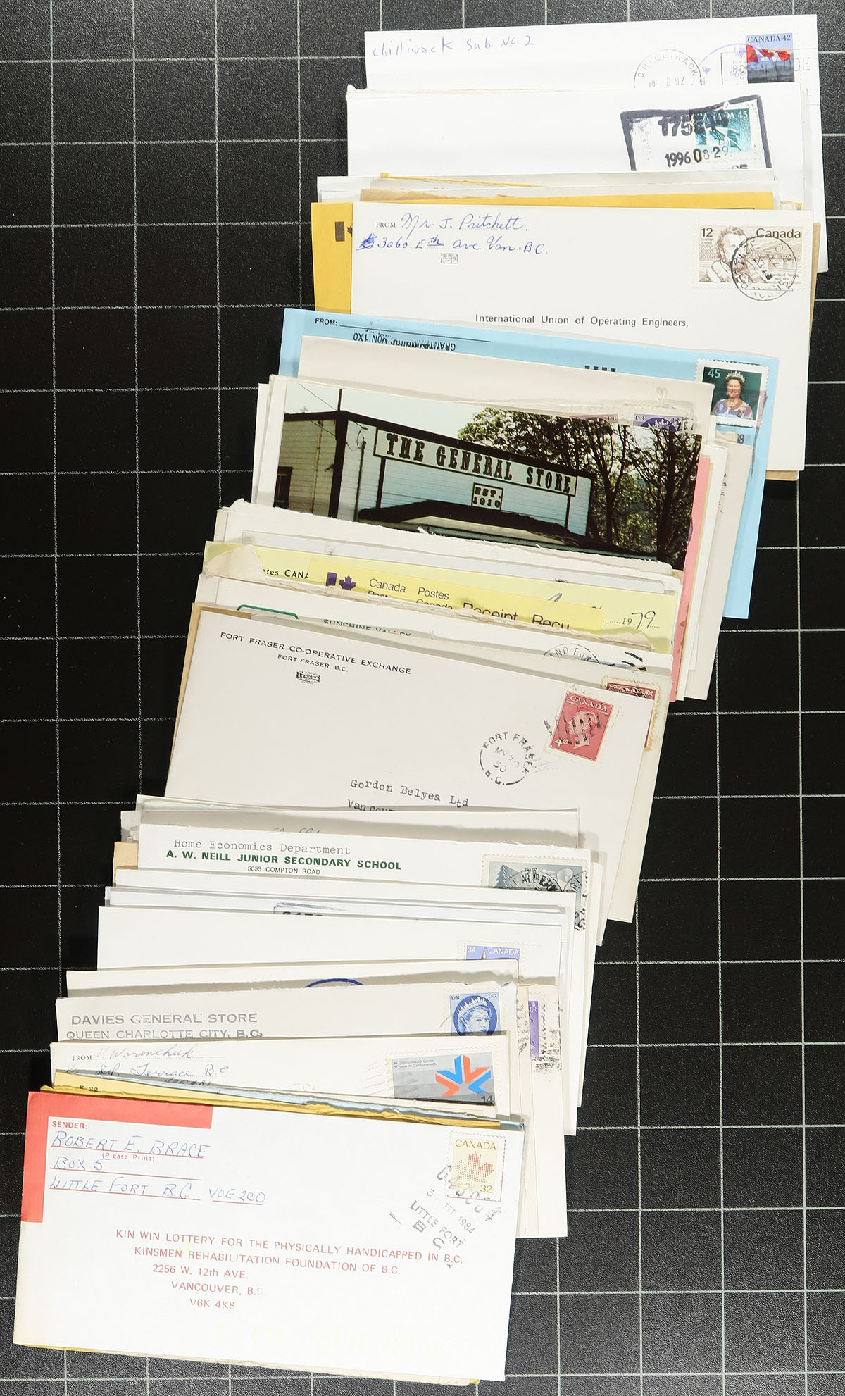 British Columbia Postmark Hoard #3. The third and final of the cloth boxes (about the size of shoebox) containing approximately 400 covers with BC postmarks. Primarily QEII era covers, with earlier items mixed in throughout. Again, the strength is in the wealth of postmarks here, selected for (primarily) hand cancels (split ring, CDS, POCON, Retail Centre, machine). Well worth the estimate of 50c per cover. Estimate =