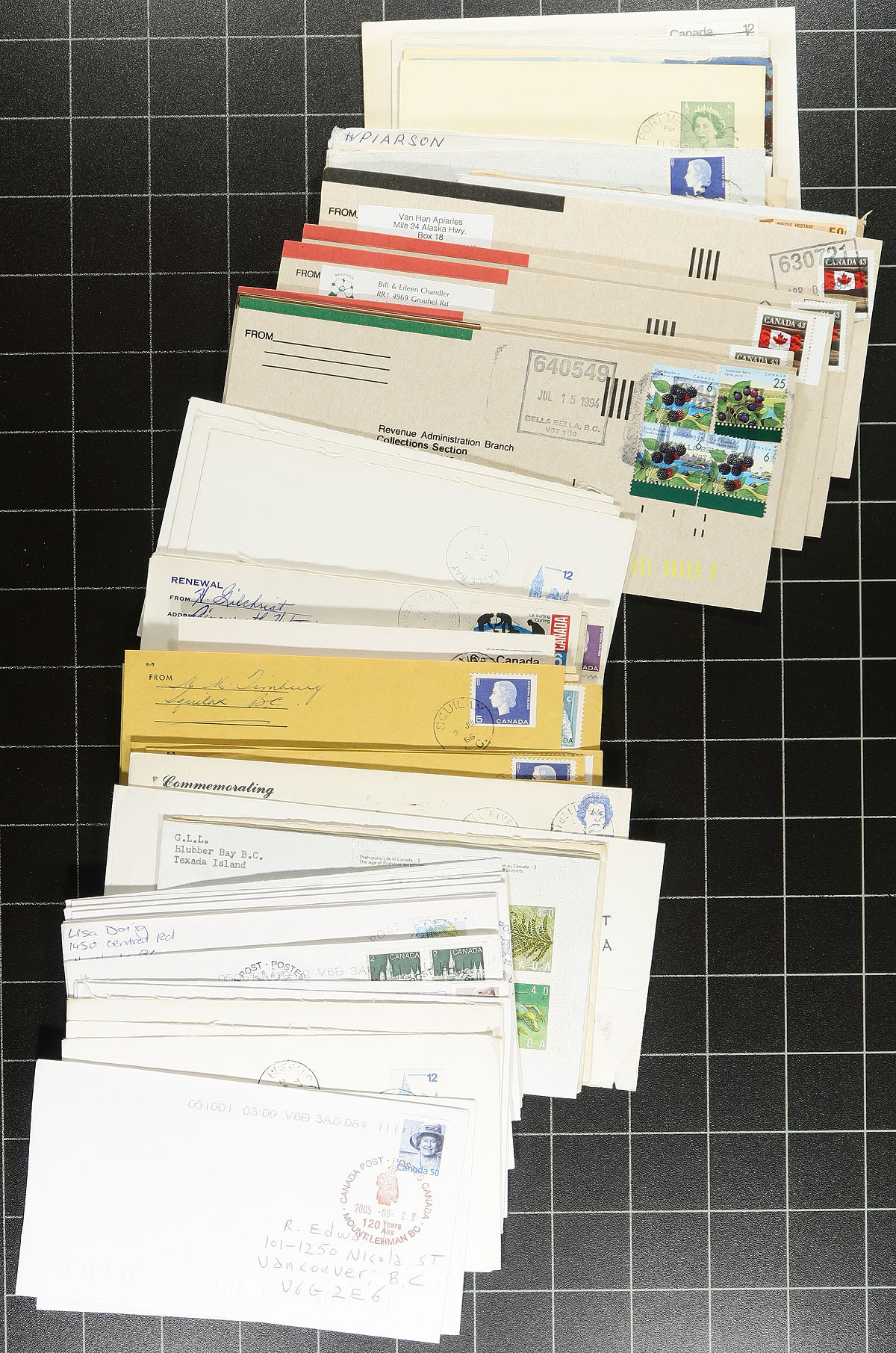 British Columbia Postmark Hoard #3. The third and final of the cloth boxes (about the size of shoebox) containing approximately 400 covers with BC postmarks. Primarily QEII era covers, with earlier items mixed in throughout. Again, the strength is in the wealth of postmarks here, selected for (primarily) hand cancels (split ring, CDS, POCON, Retail Centre, machine). Well worth the estimate of 50c per cover. Estimate =