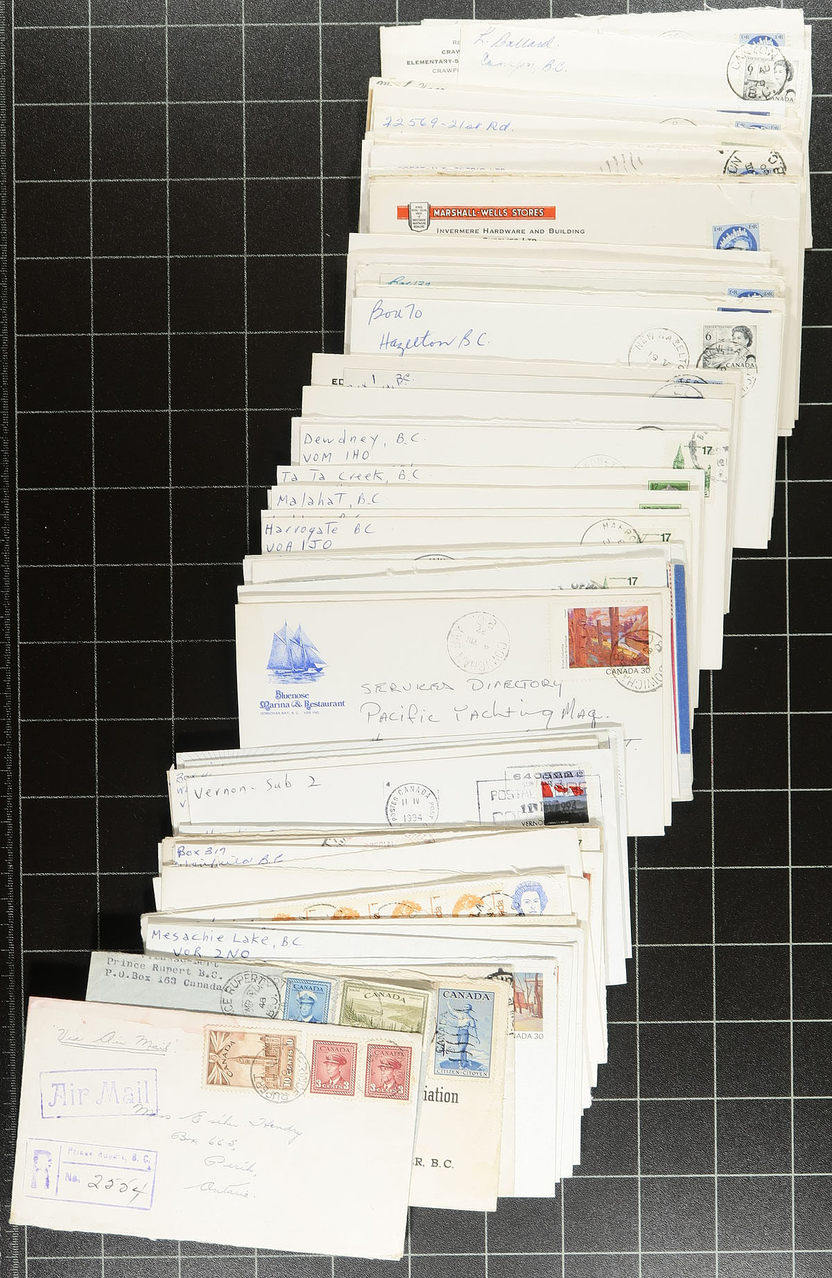 British Columbia Postmark Hoard #3. The third and final of the cloth boxes (about the size of shoebox) containing approximately 400 covers with BC postmarks. Primarily QEII era covers, with earlier items mixed in throughout. Again, the strength is in the wealth of postmarks here, selected for (primarily) hand cancels (split ring, CDS, POCON, Retail Centre, machine). Well worth the estimate of 50c per cover. Estimate =