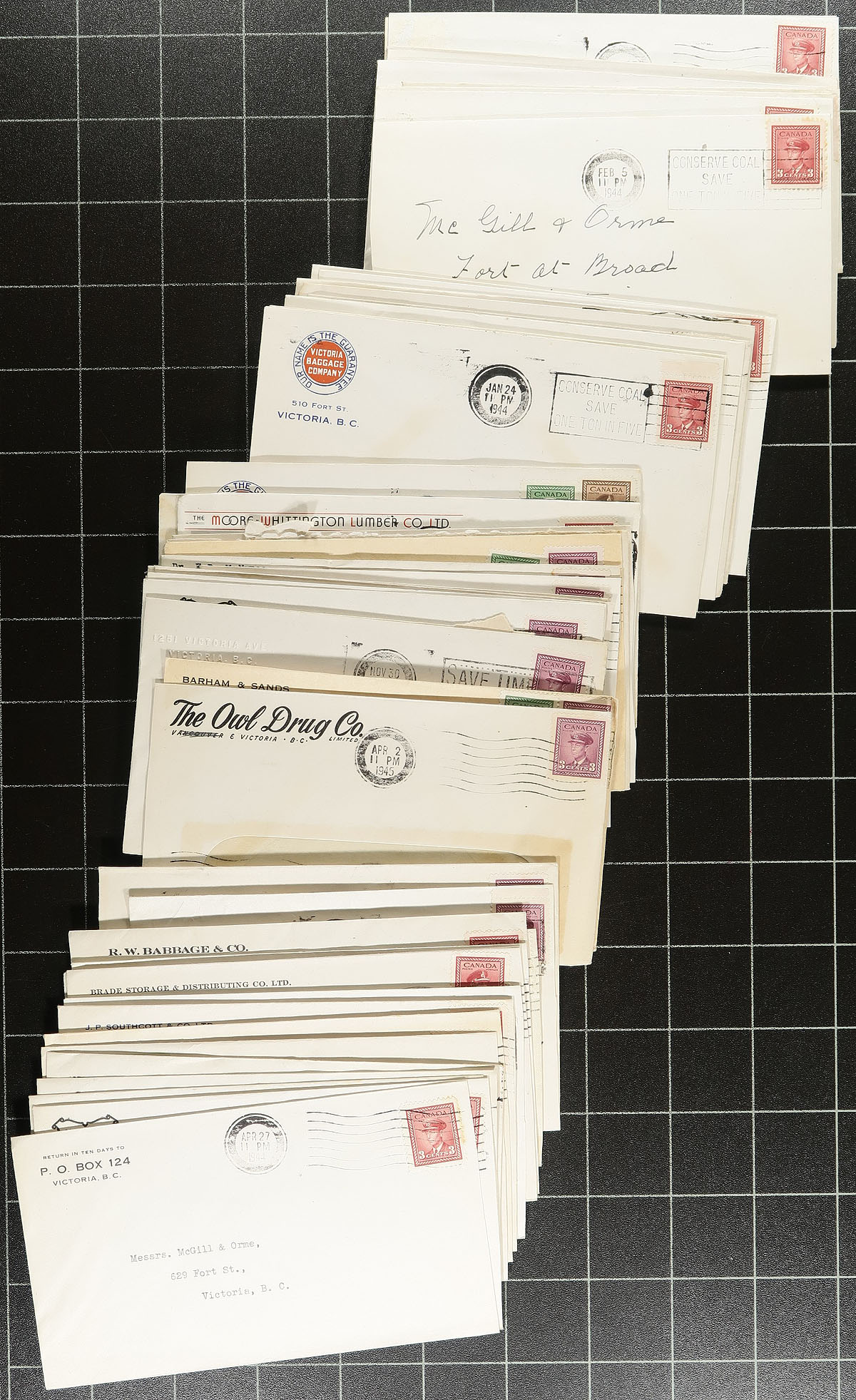 British Columbia WWII Blackout Cancels. An original correspondence hoard of over 300 covers, plus several pieces all bearing 1944/1945 dated WWII blackout postmarks from Victoria BC. All addressed to the McGill & Orme Drugstore in Victoria. Includes an array of both "wavy line" as well as multiple slogan types. A great lot for study of dates and usages in a finite period. Estimate =